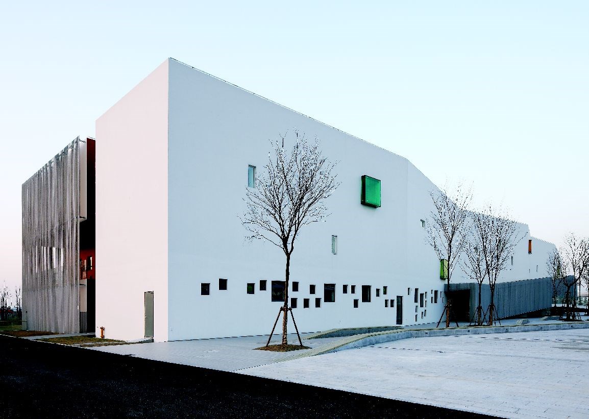 跨越台灣海峽,我們來到了上海北方的嘉定。這座江南古城現在為上海三大開發新城之一,而這間幼兒園就像天神不小心掉落的一塊白色積木,橫亙在一片灰樸樸的空地上。一個斜坡往上,大門就像個洞口,有種走進隧道冒險的感覺。