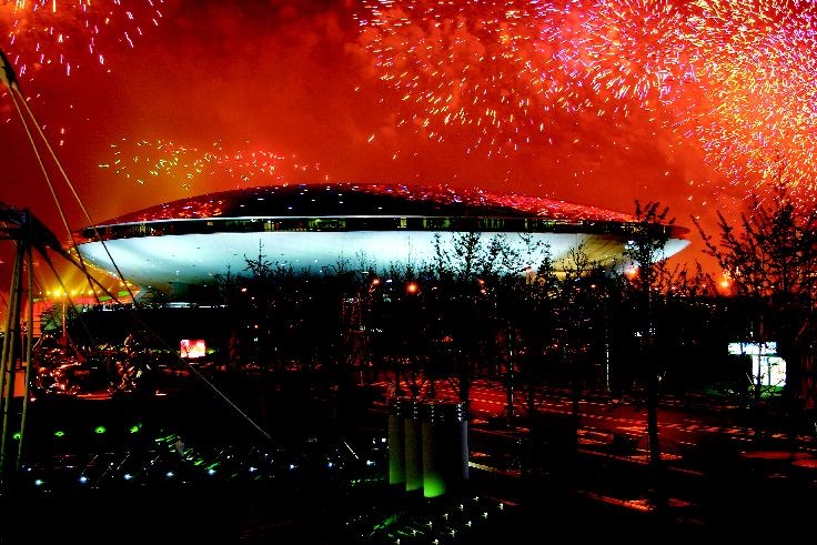 它如飛碟般降落在黃浦江邊,平台上可360度瞭望園區及黃浦江兩岸。然這成果是建築師在高度時間壓力下完成的。總建築師汪孝安回憶,直到2007年底,「連一張施工圖都沒有!」然因地處濱江綠化帶,他們借天不借地,將形體上抬,成為寬達130多米,懸地35米,如飛碟般懸浮在地面上的建築。令人開心的是它不會隨世博結束而落幕,可容納18,000人的場館11月將由王菲復出演唱會打頭陣,成為上海未來文化娛樂的首要中心。