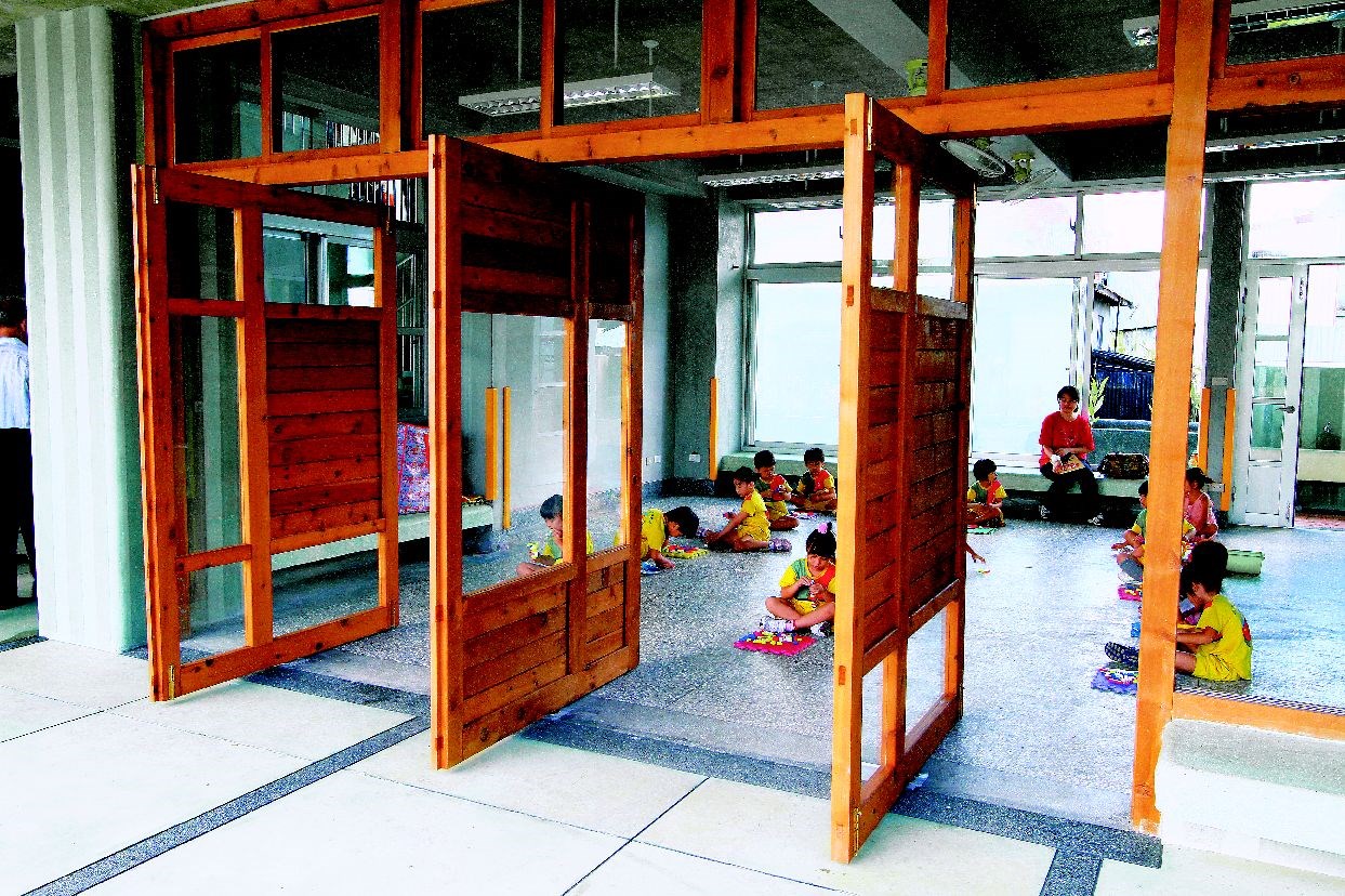 來到新城托兒所,好像不知不覺就走了進來。王柏仁說,對新城鄉居民來說,他們渴望的不只是一間幼稚園,而是一個活動會所。而廣場上的兩棵老榕樹更讓他們決定將一樓局部放空,留出大半的半戶外空間,做為鄉民穿越的社區廊道。用可九十度旋轉的香杉木大門代替外牆,門一開,教室空間跟著放大,屋內空間自然延伸到戶外廣場。