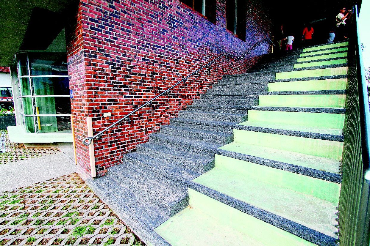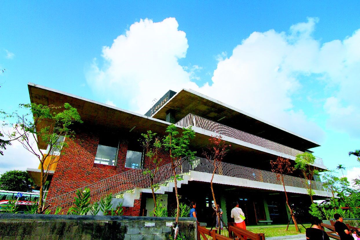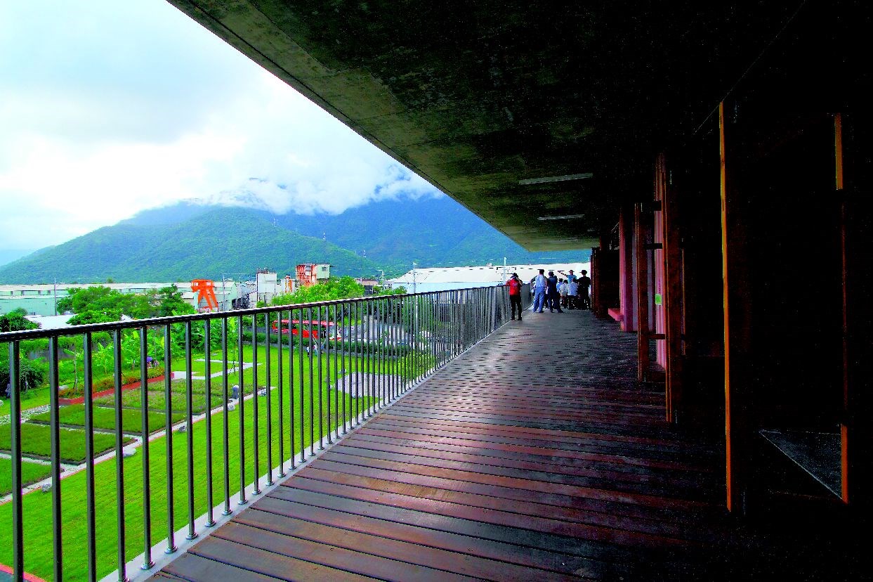 為了南面的採光及阻擋颱風時的豐沛雨量,建築師則採用大懸臂的清水樓板。往外延伸的樓板就像大屋簷,覆蓋住所有的室內空間。走在這通透的建物中,第一個感受到的是涼風,美麗的中央山脈就在眼前。建築師在選材上,也以原色的自然素材為主。斑駁的清水模板,焦黑紋路的火頭磚牆面、煤渣染黑的墨綠色洗石子外牆,建築師希望小朋友摸到看到的,都是這些閃著天然手感色澤的材質。