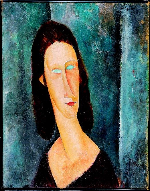 義大利天才畫家阿美迪歐‧莫迪里亞尼的「藍眼女子」,則是描繪當時與他熱戀的十九歲女大生尚娜.赫布特尼。畫中女子如同雕刻般拉長比例的臉部,微翹嘴角漾出優雅笑容,宛如外星人沒有瞳仁的湛藍雙眼,空洞又神秘。然畫作背後卻有瘋狂淒美的故事,懷才不遇的莫迪里亞尼,英年早逝。當時懷了九個月身孕的尚娜因悲傷過度,跳樓殉情。徒留美麗畫作見證兩人濃烈愛情。