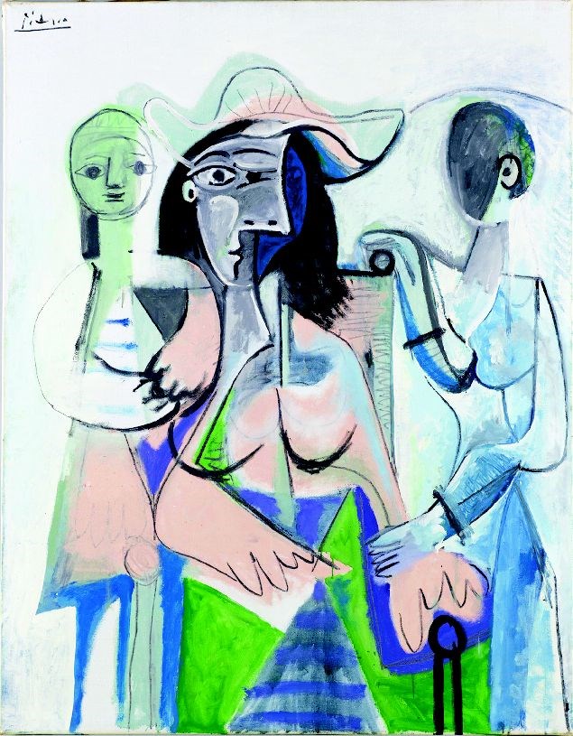 更難得的是,大師們背後的女人也在這次展覽悄悄曝光了。開朗的雷諾瓦夫人、憂鬱的塞尚夫人,畢卡索「女人與小孩」,則以新婚妻子賈桂琳及兩個女兒為主角。採用立體派的手法勾勒賈桂琳的面貌,大眼小女孩是畢卡索與前妻的女兒帕洛瑪,另一邊緊拉著媽媽、沒有五官的則是賈桂琳的女兒凱西。將賈桂琳的臉分成兩半,正面看來神態自若,側邊看著凱西的表情,則略帶疼惜的憂鬱。這幅少了男主人的全家福畫作,流暢的線條與粉嫩色彩,象徵兩個家庭充滿希望的結合。