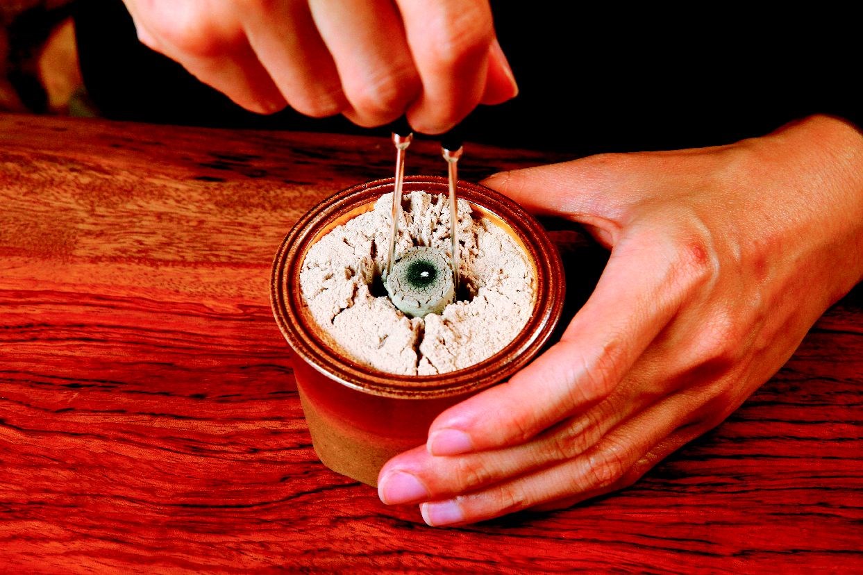 燃燒一陣後,江赫用手試溫度,感覺火候已夠,便開一個火孔,置一片銀葉(雲母片)於其上,一方面聚熱,一方面隔掉灰炭的味道,再以香箸夾一片香木,放在銀葉上。