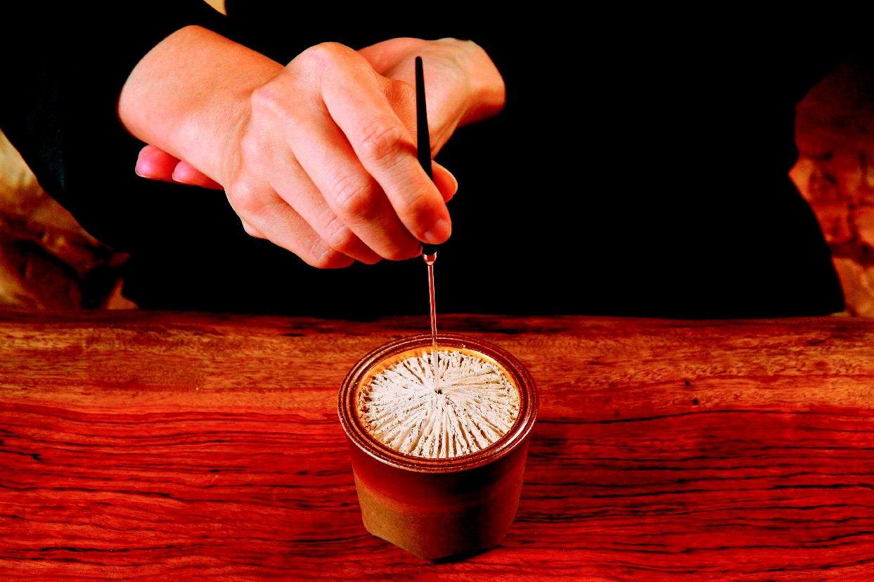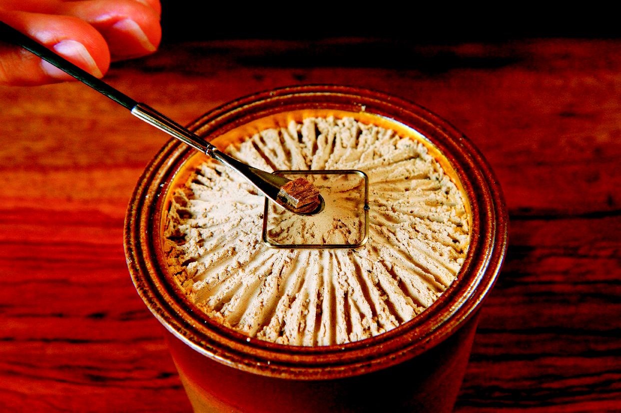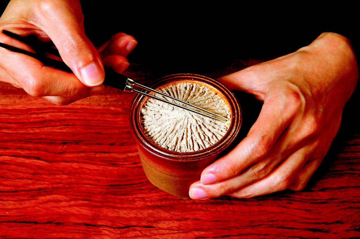 江赫的父親早年在東南亞經商時,就大量買進香木,對一般人而言,奇楠等頂級沉香遙不可及,但江家到處都是;江赫也因從小接觸原木,又鑽研香道多年,而成為藏家取經的對象。 這天,在平日不對外開放的不二齋,江赫為我們示範正統香道。首先是起爐,只見他用一個盛滿香灰的香爐,撥出一個小洞,夾一個已燃的炭團進去,用灰壓或火箸埋回,再以羽帚清理爐邊。