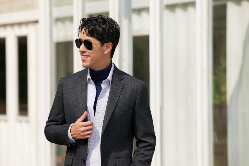 充滿摩登都會風格的灰組織紋成套西裝,以100%純羊毛製成,布料由灰白色紗交織而成,有著麻花復古特色,展現濃厚秋冬氛圍,布面經磨毛處理舒適柔軟。內搭深藍條紋襯衫,可修飾身形的剪裁,設計具牛津感,將前釦刻意打開2-3顆,層次配搭高領衫,即能展現休閒率性意象。