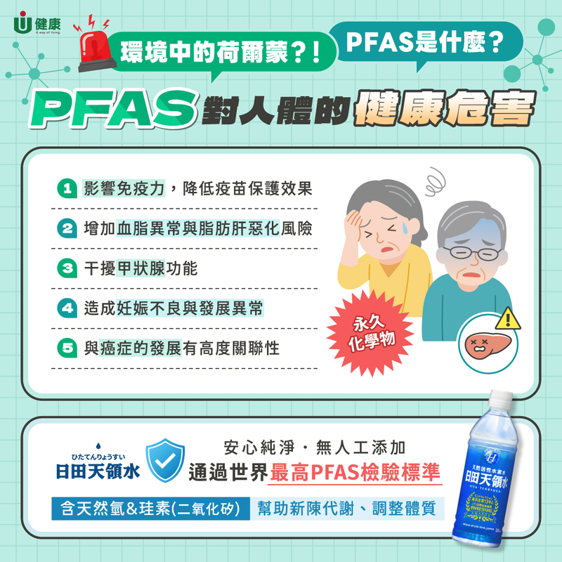「環境賀爾蒙 (PFAS)」是一大類人工合成的含氟化學物質,因不易分解也被稱為「永遠的化學物質」。一旦被人體吸收,即便超過40年,也不一定可以代謝完全,長期累積在內臟中將對健康產生危害。帶來的影響如下:干擾人體内分泌,有引發腎臟癌、免疫疾病、胎兒發育不全等風險。