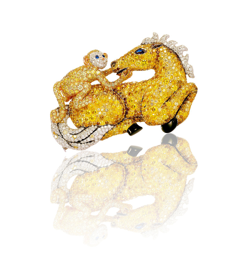 Anna Hu 以西方高級訂製珠寶的精湛工藝,凝鍊刻畫靈猴騎乘駿馬、奔騰向前的瞬間動勢。層次豐富的寶石色彩,結合流暢而細膩的金屬線條,構築出動靜相生、張力與莊重並存的視覺節奏。