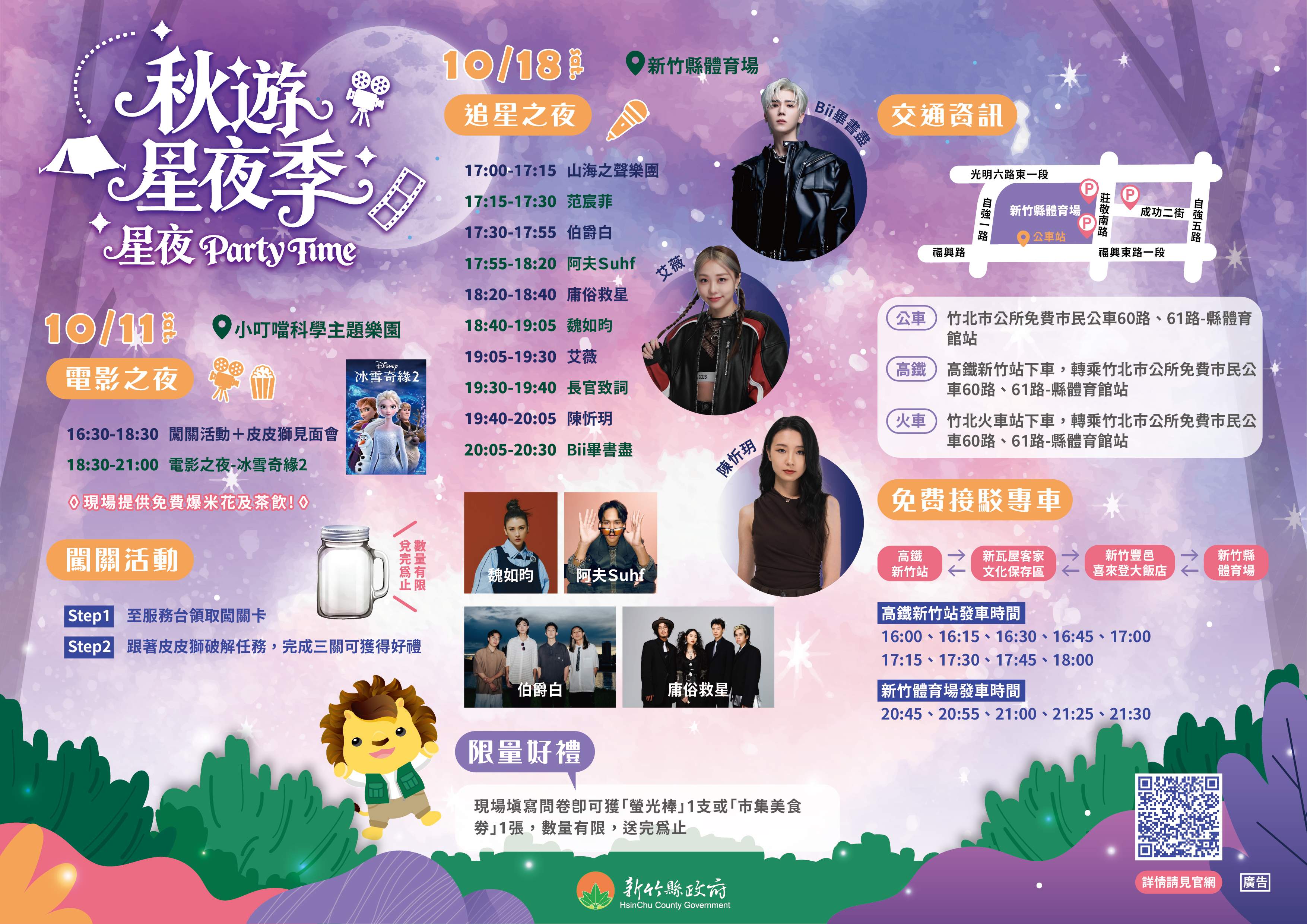 為便利外地遊客,新竹縣政府規劃高鐵新竹站至新竹縣體育場的免費接駁專車,並增設新瓦屋客家文化保存區、新竹喜來登大飯店停靠點,讓遊客更容易參與這場秋夜盛會。歡迎全台民眾把握秋高氣爽的時節,一同來新竹縣享受星光下的音樂、美食與創意體驗,創造專屬秋夜的回憶。更多活動詳情請上官網查詢(https://travel.hsinchu.gov.tw/Event/starrynightfestival)