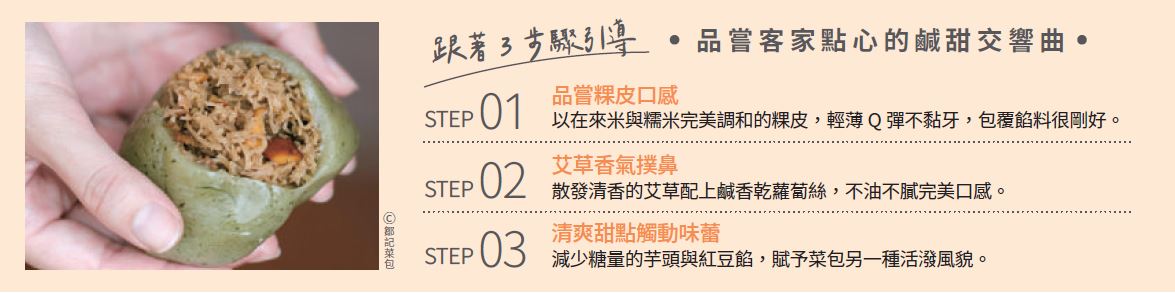 鄒記菜包的皮,是用在來米與糯米依比例調和而成,口感Q 彈卻不黏牙,完美復刻了奶奶的配方。艾草香氣淡雅不搶味,蒸出的綠意十分飽滿,這也是客家菜包與南部用鼠麴草染綠的「粿」最大的差異。