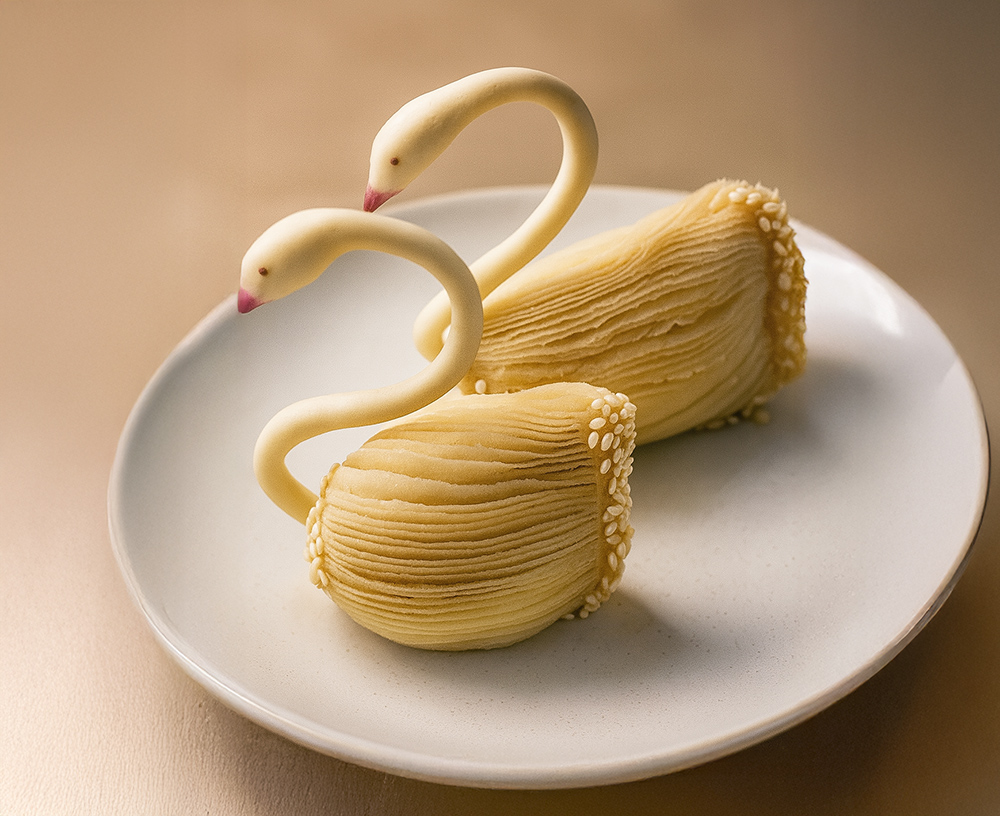 以手工千層酥皮捏塑天鵝造型,外觀優雅,內餡是蜜汁火腿與白蘿蔔絲的組合,鹹甜交錯,咀嚼間酥皮層層脆化,與蘿蔔絲的清爽形成反差。