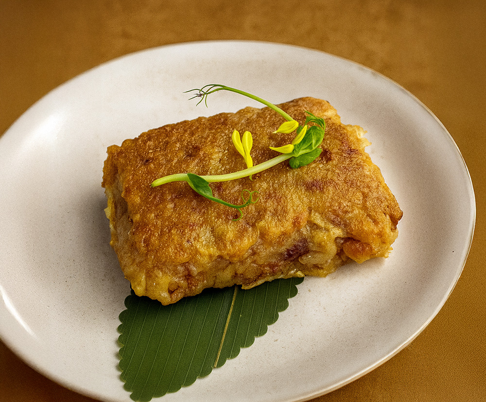以長糯米混入瑤柱絲與醃製雞腿肉,包裹鹹蛋黃後用荷葉包封,再以平底煎至外皮微焦。米香與荷葉香氣交織,入口時,瑤柱的鮮甜與雞肉的鹹香層層釋放,是對經典糯米雞的酥香升級版。