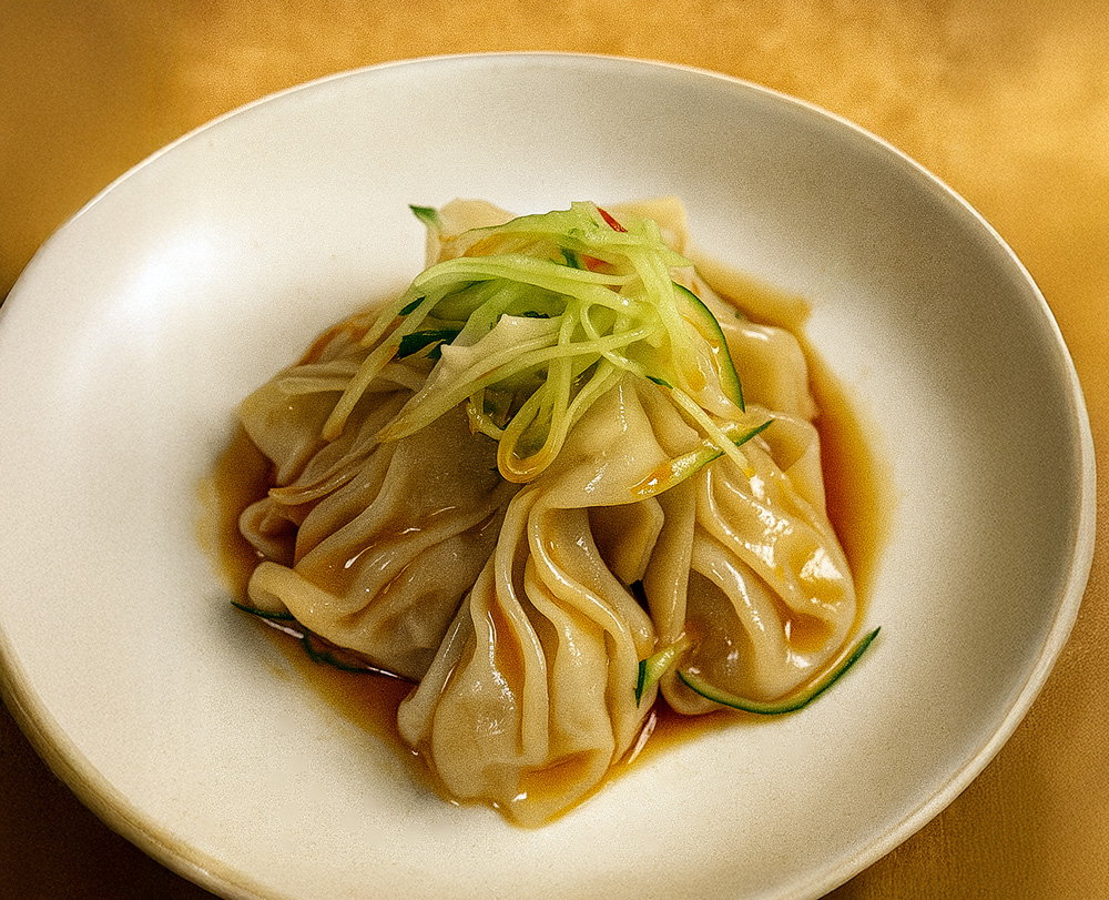鮮餛飩皮薄餡厚,包裹鮮肉與蝦仁,搭配自製紅油,麻香在舌尖先行鋪開,辣度隨之漸強,但不掩食材本味,反而帶出鮮甜。