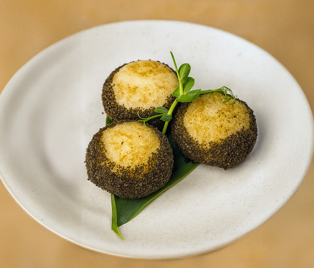 竹炭澄粉皮色澤深邃,內包鮮蝦與蟹肉,咬下去能感受到蝦肉的彈性與蟹肉的細膩纖維,表面點綴鮭魚卵與黑魚子醬,帶來輕盈的海鹽香與爆漿口感,從視覺到味覺皆精緻。