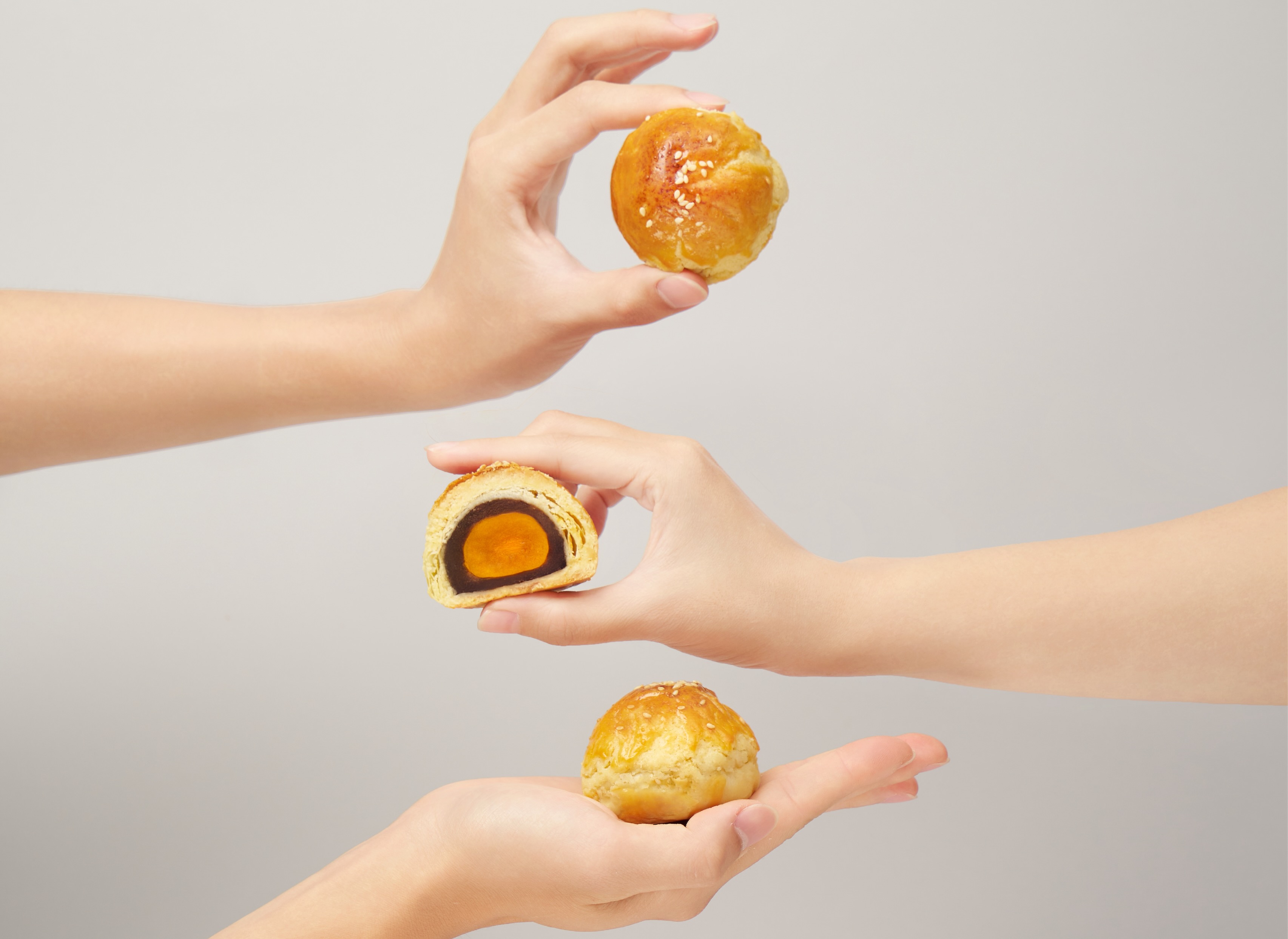 這顆「法式菠蘿蛋黃酥」最引人注目的,是其口感層次的設計。外層菠蘿皮經高溫烘焙後,呈現金黃裂紋,入口瞬間散發奶香與焦糖化的甜脆。中層選用鬆軟細膩的油皮,鎖住香氣而不顯厚重。最內裡則是精選最大規格的鹹香鴨蛋黃,搭配減糖紅豆餡的柔和甜味,鹹甜平衡,帶來「外酥、中潤、內綿密」的多重驚喜。