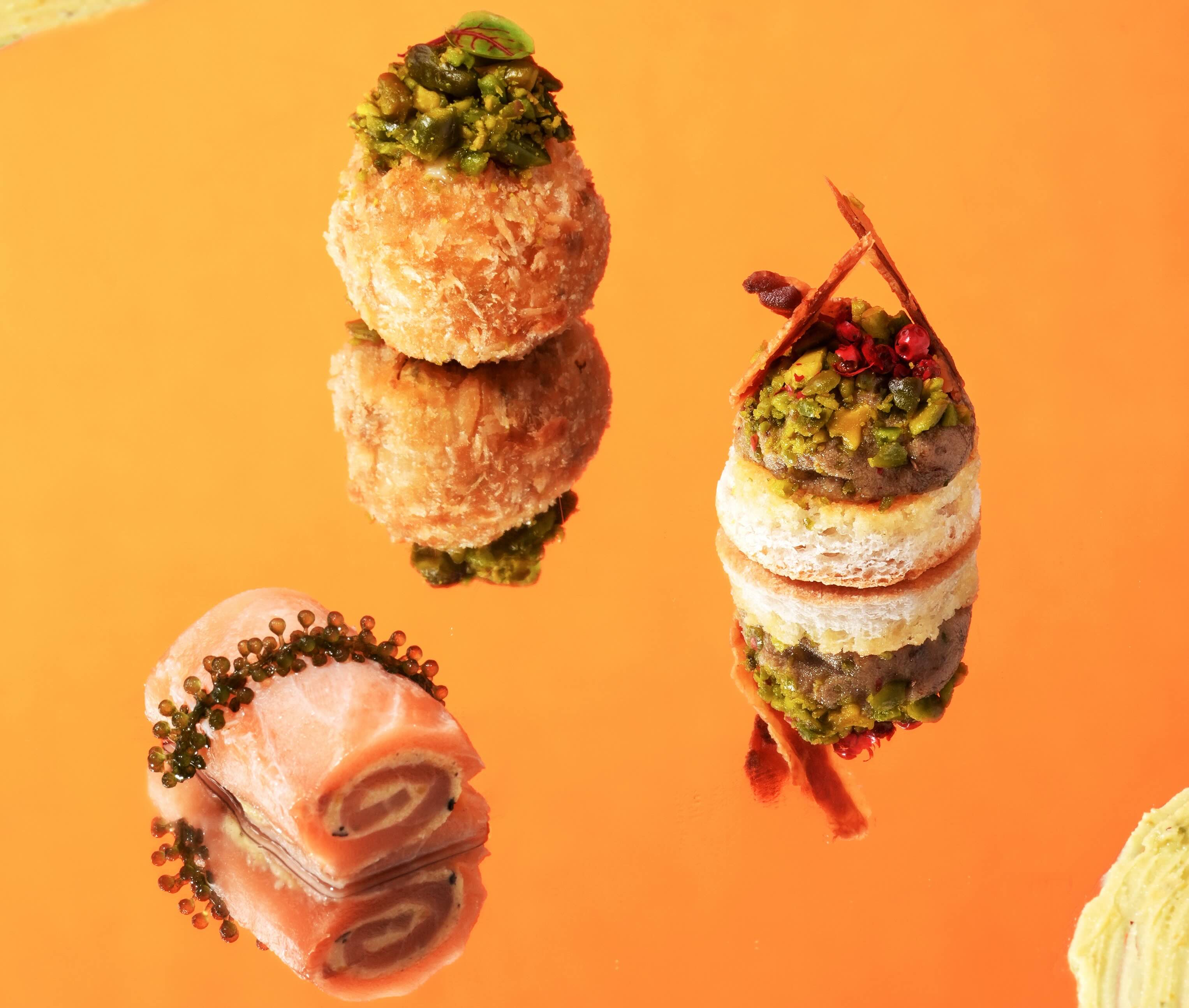左起為「松露開心果奶酥燻鮭捲」、「酥炸墨西哥輕辣開心果奶油起司球」、「脆培根、巧克力開心果杏桃醬」,展現鹹甜交融的味覺層次。(圖片來源:台北W飯店)