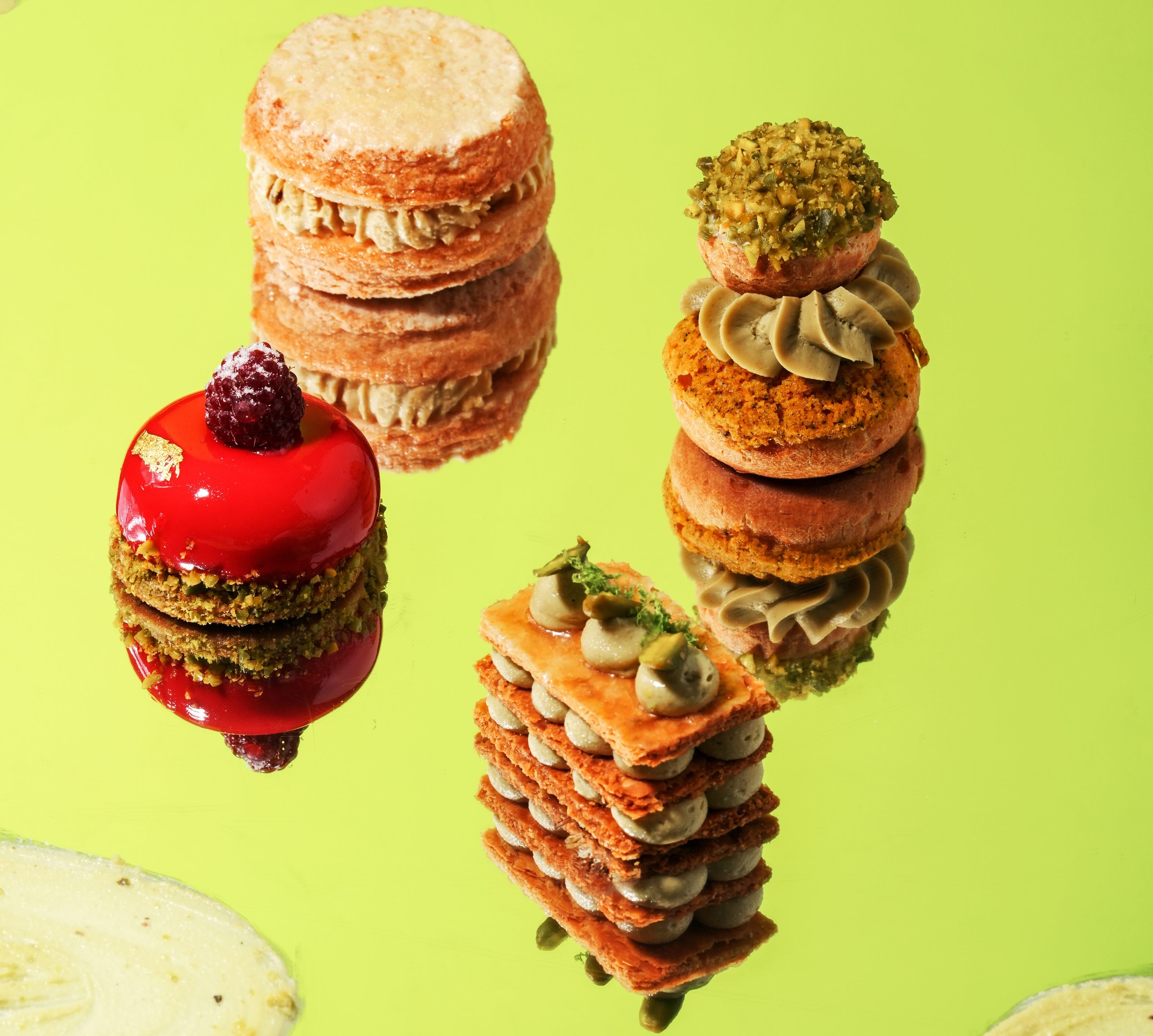 PISTA CIAO的明星商品「焙茶開心果達克瓦茲」原封不動登場,鬆軟餅皮夾入焙茶與開心果冰心餡,堪稱整場的主角。甜點主廚何玉梅則發揮創意,打造如珠寶般精緻的甜點陣容——「開心果白巧克力修女泡芙」以雙層結構呈現對稱美感;「開心果草莓凍慕斯蛋糕」結合馬斯卡彭與草莓凍,層次豐富又輕盈;「開心果卡士達拿破崙派」則以糖衣派皮與檸檬絲點亮濃郁口感。