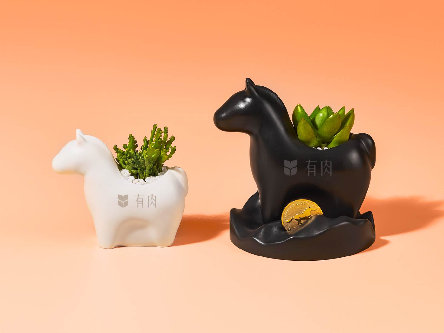作為深耕植栽設計的品牌,有肉今年首次推出馬年限定造型植栽與山水盤系列,黑馬、白馬兩種造型、大小共四款,既俐落又具象徵性,多肉栽種在其中,像把綠意與祝福一併種進家裡。
