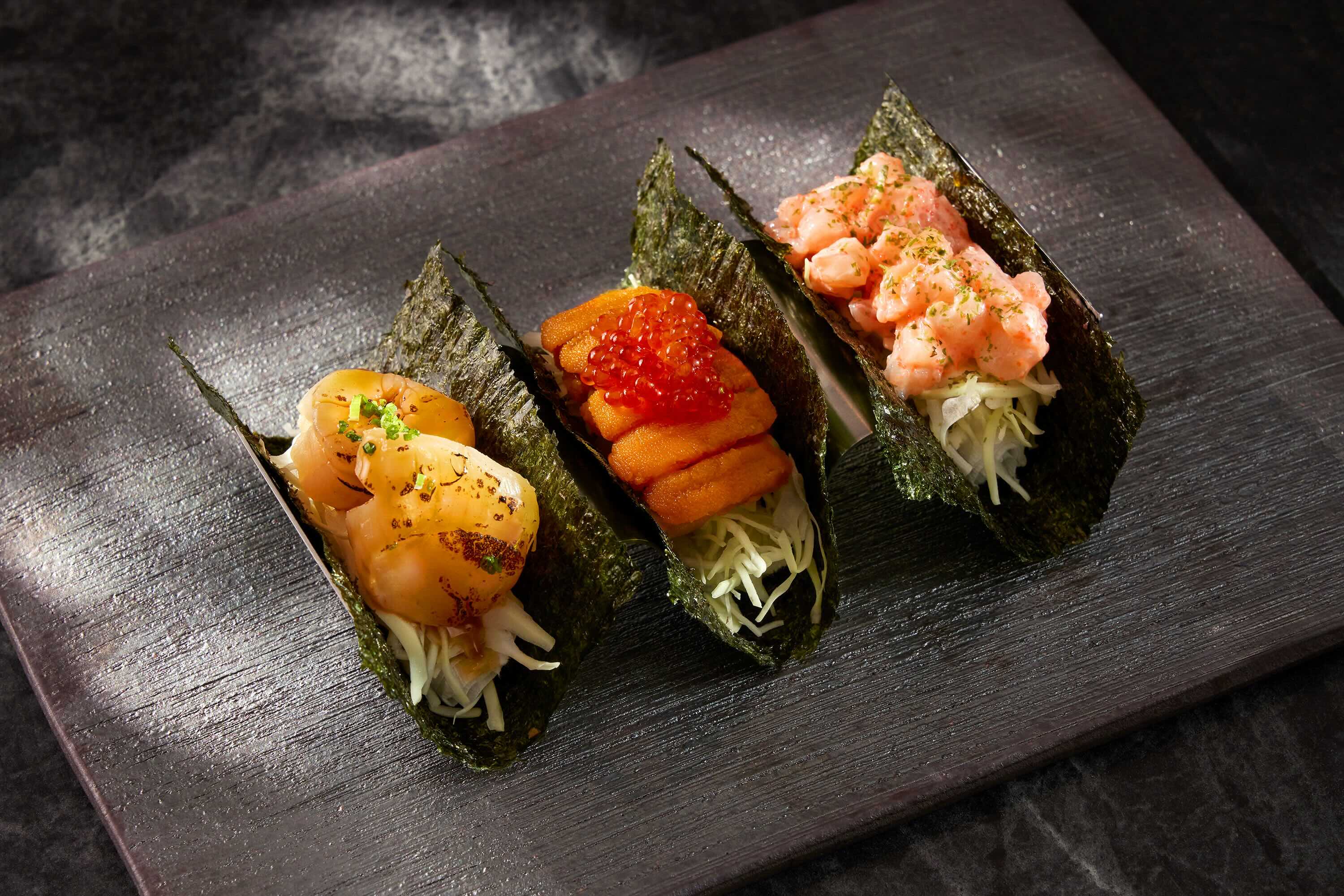 職人現場演繹炙燒與手捲,首推口感豐盈的「海膽鮭魚卵手捲」,滿足海鮮愛好者的極致味蕾 。(圖片來源:台北寒舍艾美酒店)