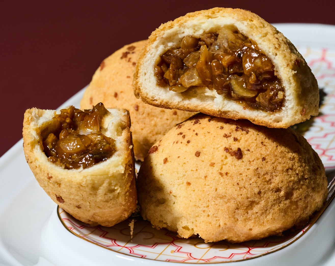山里紅燒豚包外層以二次發酵麵糰擠上酥油烤出金黃裂紋,呈現招牌「雪山」外殼。(圖片來源:三點三DIM SUM TIME)