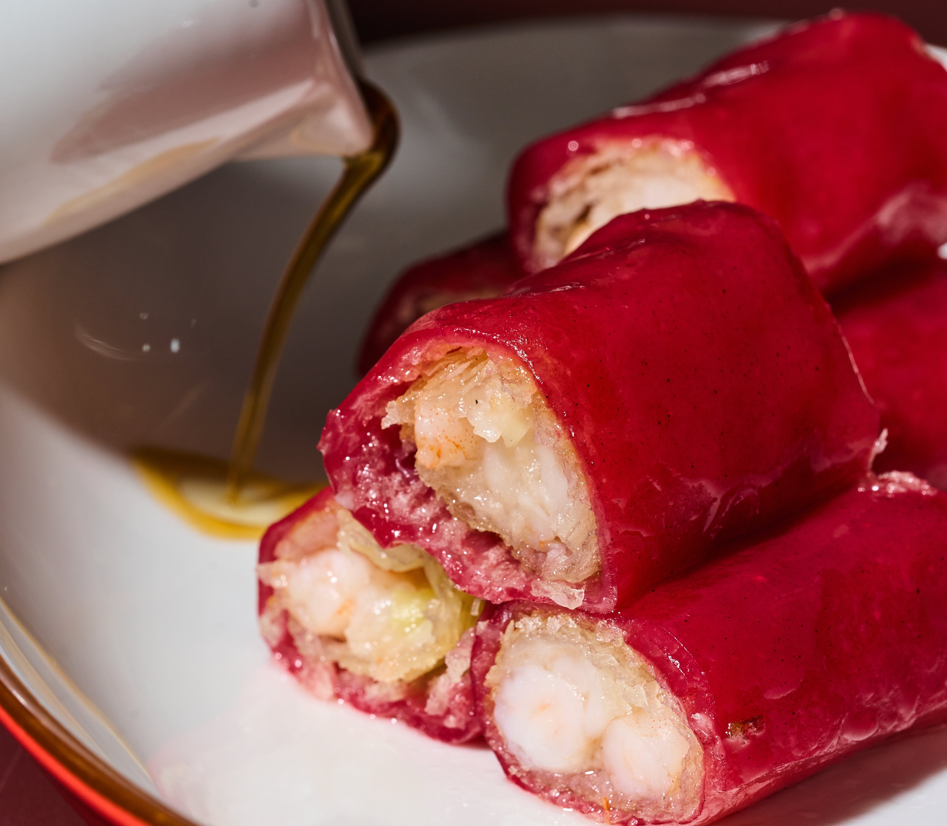 紅麴米漿蒸成的自然紅粉腸粉皮,外滑內脆,鮮蝦、韭黃、筍丁包進炸得酥脆的米網皮,一口多重口感。(圖片來源:三點三DIM SUM TIME)