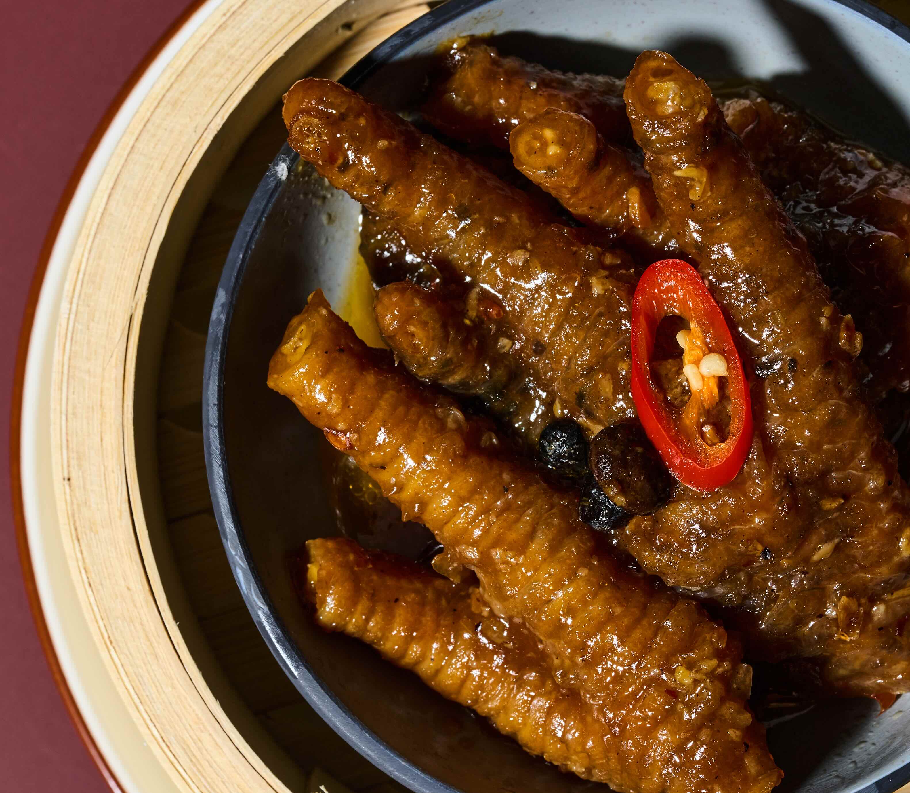 香蒸鳳爪選用膠質飽滿的台灣土雞爪,經刷皮水、高溫炸成虎皮、再滷與蒸製,骨肉分離、膠質豐盈。(圖片來源:三點三DIM SUM TIME)