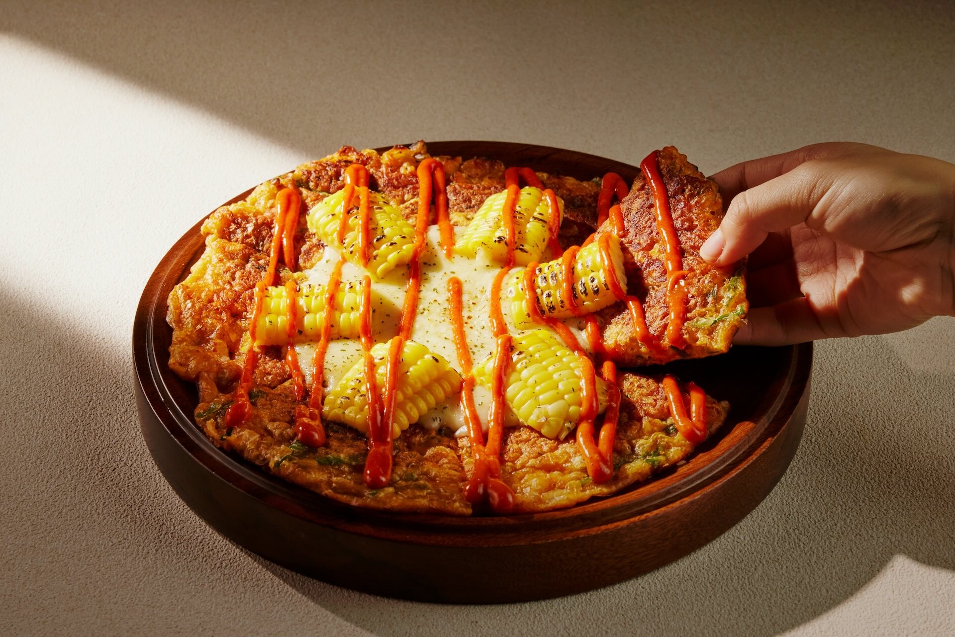 玉米、莫札瑞拉起司與韓式泡菜交織的辛奇煎餅,甜辣交錯、外酥內Q,是炸雞之外的人氣配角。(圖片來源:橘焱胡同集團)