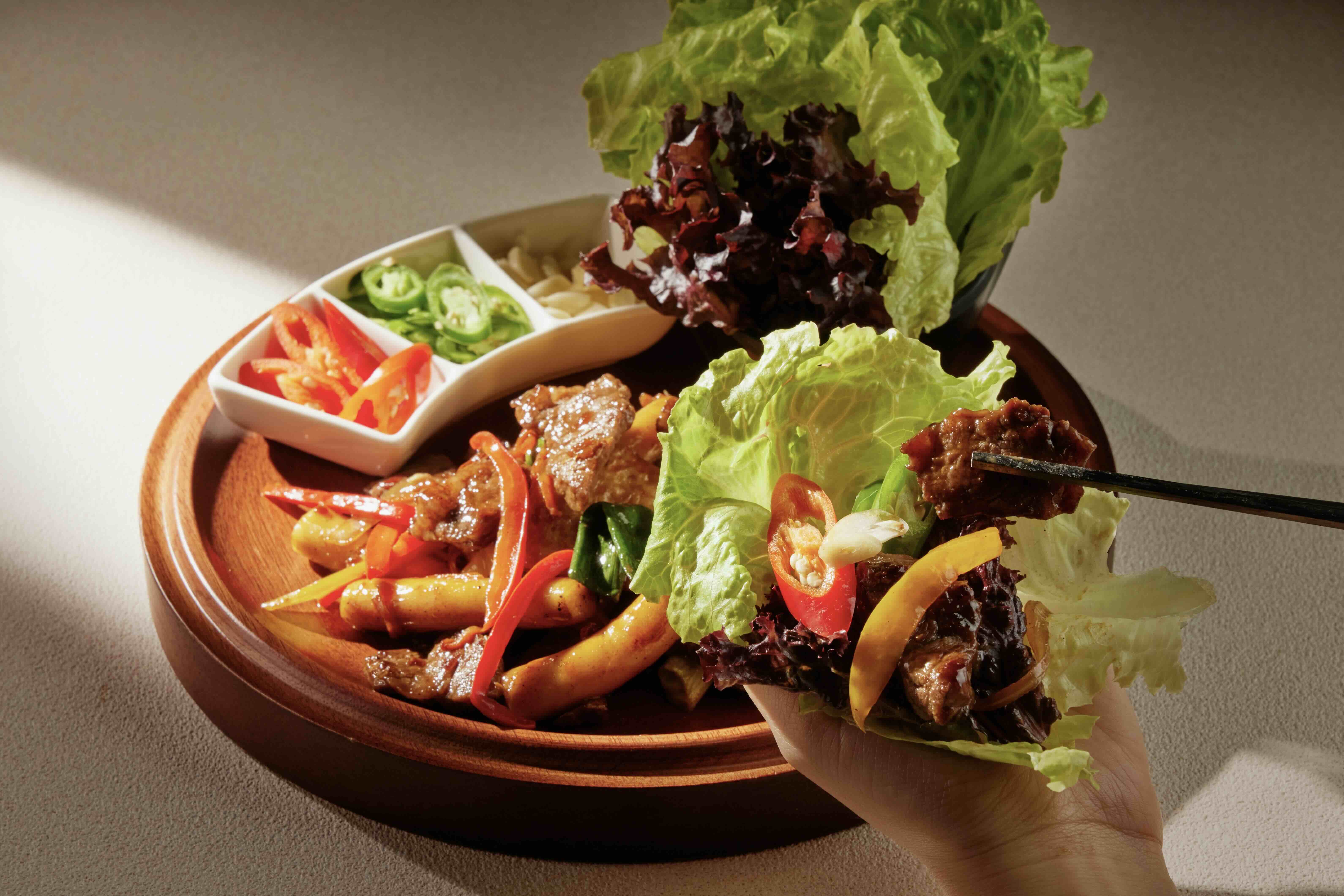 韓式宮廷年糕以韓式烤肉醬大火快炒年糕與肉片,鍋氣十足、醬香濃厚。(圖片來源:橘焱胡同集團)