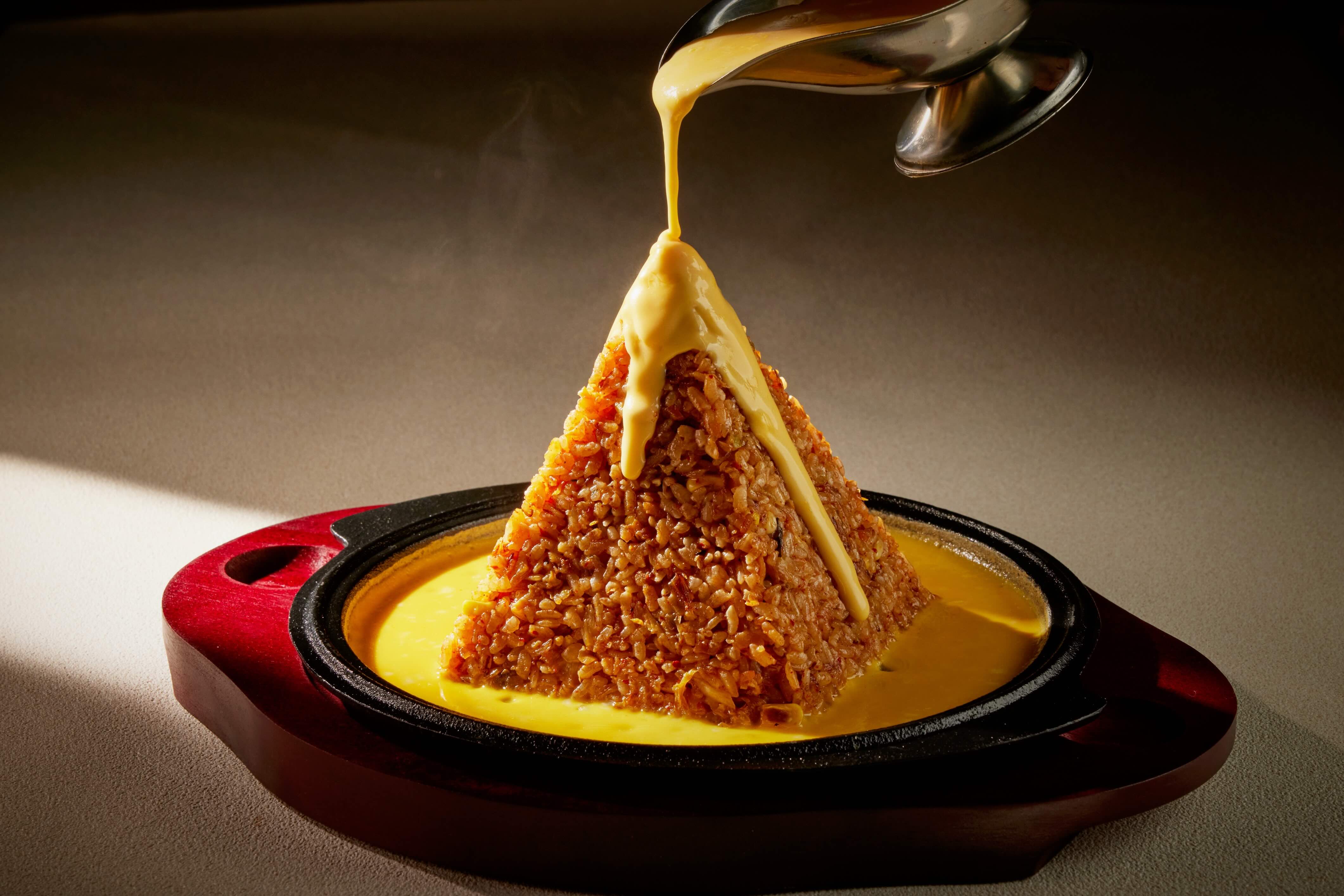桌邊淋上濃厚芝士醬的紅王醬芝士辛奇拌飯,融合火雞醬與洋釀醬調製的特製紅王醬,熱騰騰上桌,香氣濃烈。(圖片來源:橘焱胡同集團)