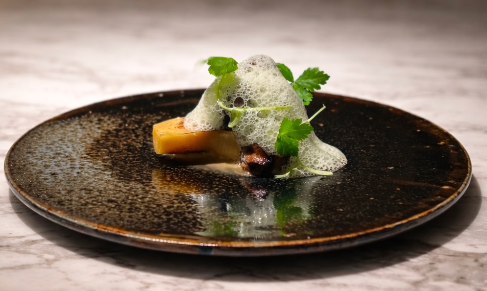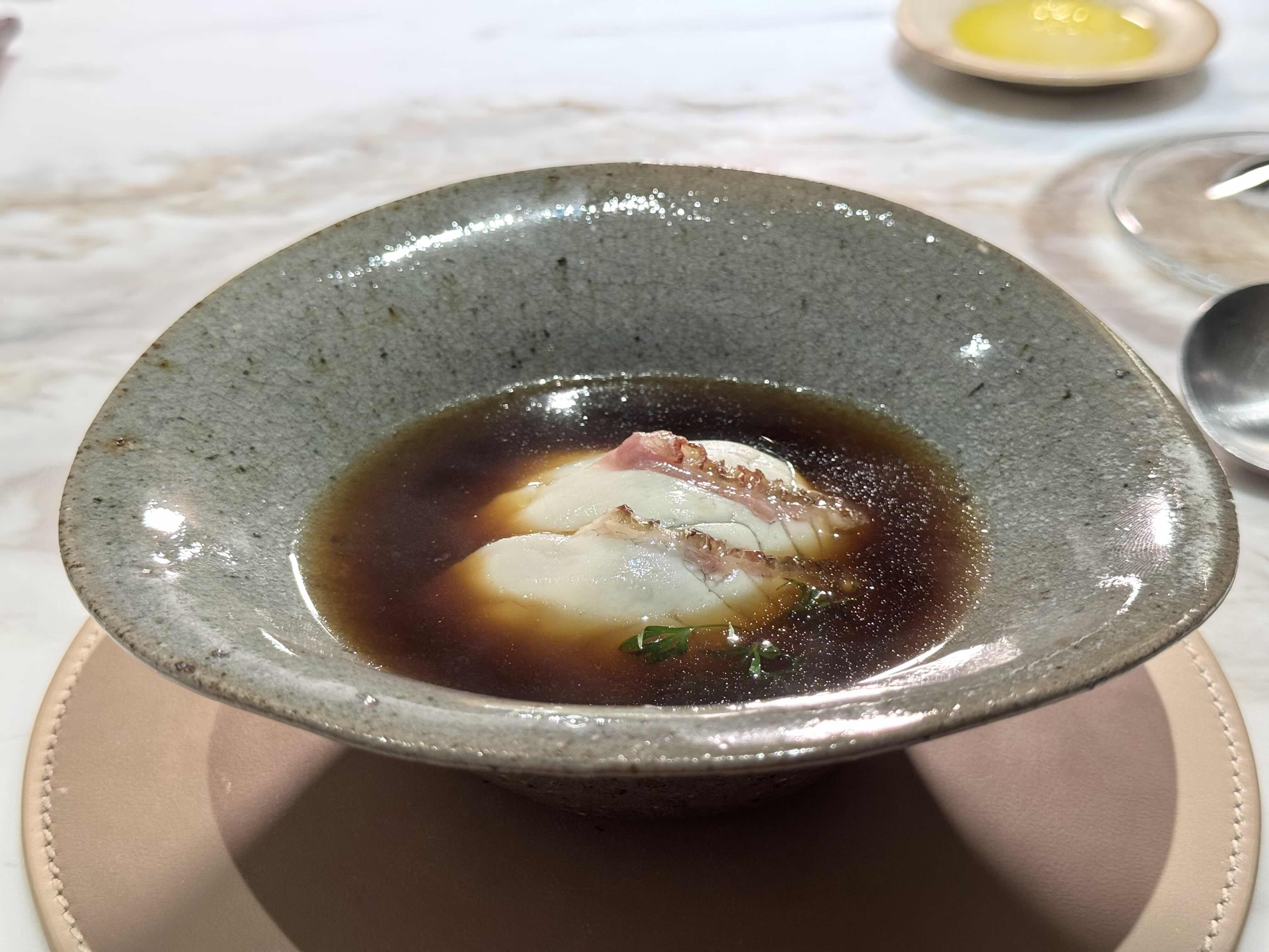 熱前菜讓味覺開始有明顯的溫度上升。飛松主廚指出,台灣冬筍比較扎實、彈牙,經過汆燙、炙燒、燉煮三層處理,將甜味層層推進,這也是他選擇冬筍作為這一段風味轉場的原因。法國蝸牛則以煮與烤保留彈性。布根地奶油泡沫與羊肚菌讓這道料理呈現飽滿的冬季口感,而山芹菜的高香則像季節轉換時吹來的第一股風。