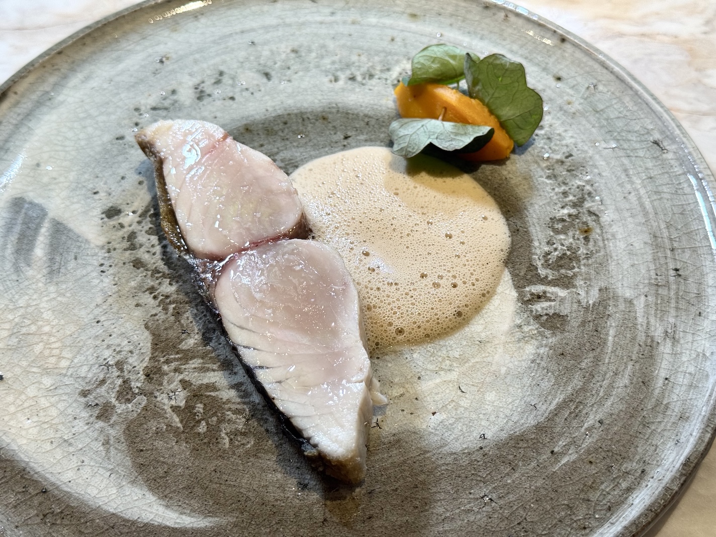 主餐前的魚料理採用日本旬魚,搭配南瓜泥與以雪莉酒、乾蔥熬成的酸香醬汁。這道料理像是整套菜單的溫和收束,它的角色,是把風味曲線留在柔軟的區間,引導主餐登場。