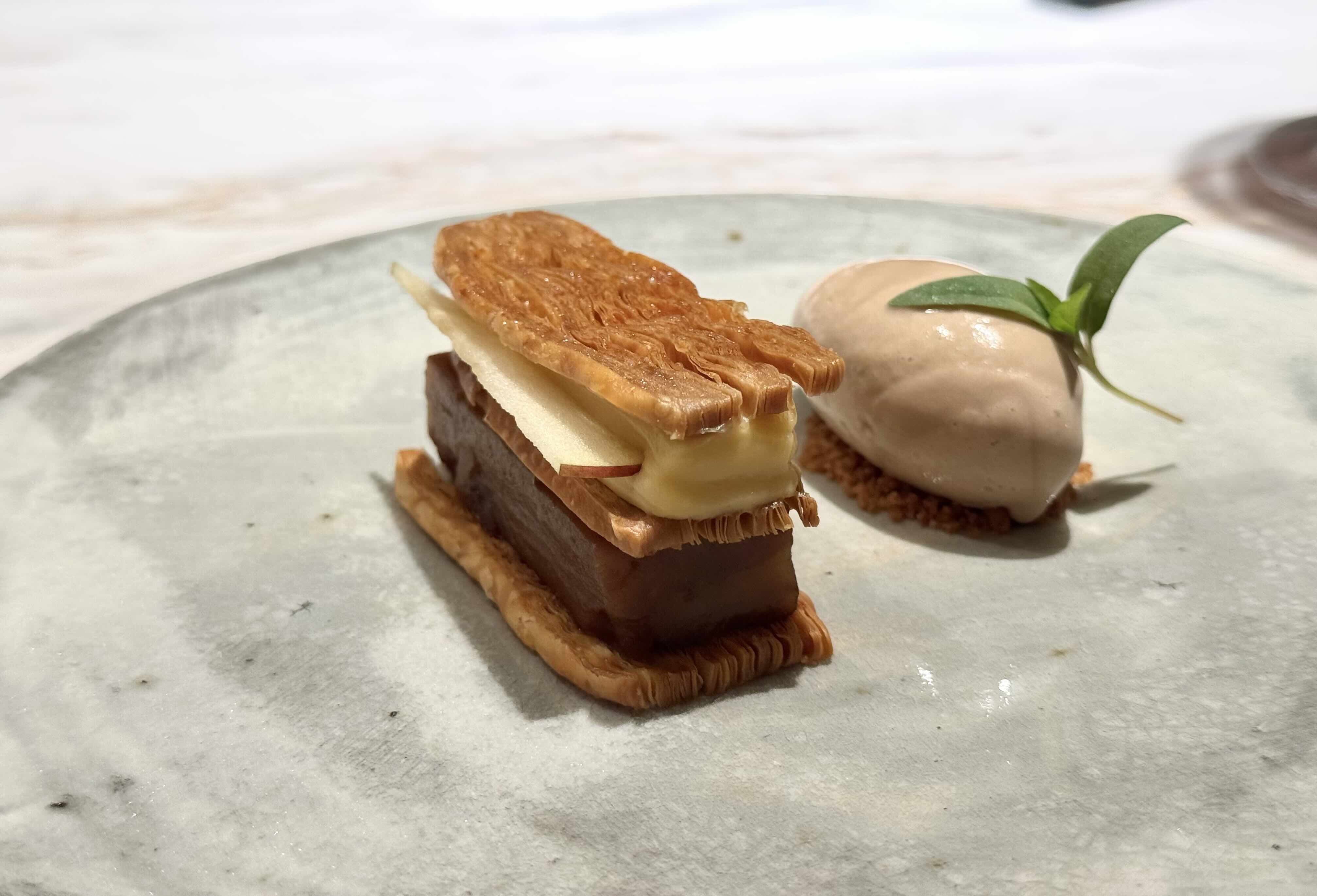 甜點是一道溫熱的蘋果千層派。使用新生富士蘋果,堆疊烤蘋果與新鮮蘋果片,再以威士忌奶霜增添香氣深度。旁邊的蜜香紅茶冰讓整道甜點的層次在熱與冷之間來回,像冬季深夜裡的微光,柔軟卻有力。