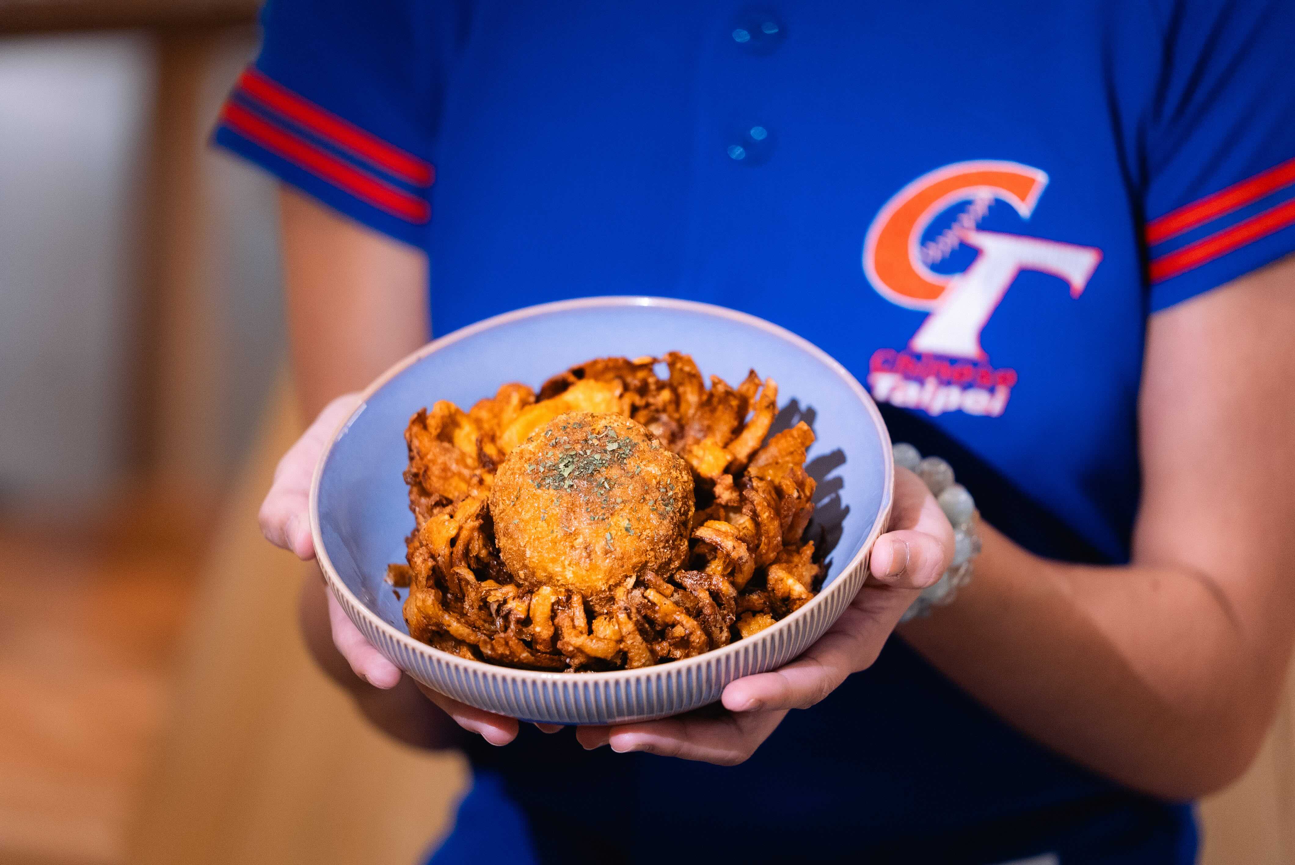 最關鍵的一步,是靈感乍現的「炸洋蔥花」。研發師傅在某次測試中在底座加了洋蔥花,發現辛香的焦糖化氣味能完美串聯和牛油脂與蛋黃的濃郁,一瞬間讓整道料理的層次感提升了好幾個段位。而且這朵洋蔥花還有另一個寓意——「和牛抱蛋」在日本巨蛋開打,就用一朵「日本爆蛋」(炸洋蔥花)把整個巨蛋給「封印」住,象徵台灣讓日本隊一分未得、完封作收。