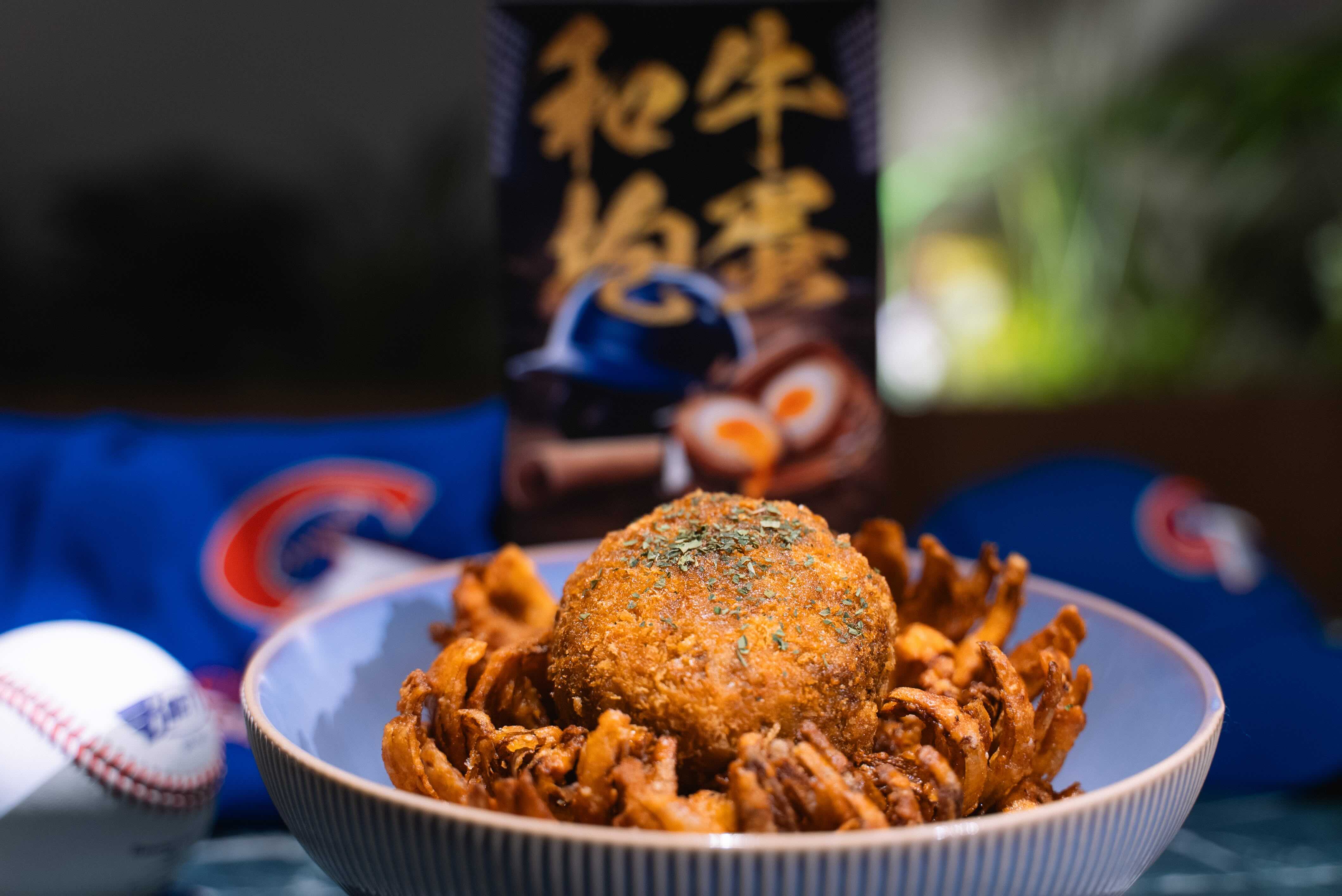 GUMGUM推出WBC限定料理「和牛抱蛋」,以黑毛和牛絞肉包覆生食級放牧蛋,搭配酥脆麵衣與炸洋蔥花,層次豐富。(圖片提供:GUMGUM Beer & Wings)