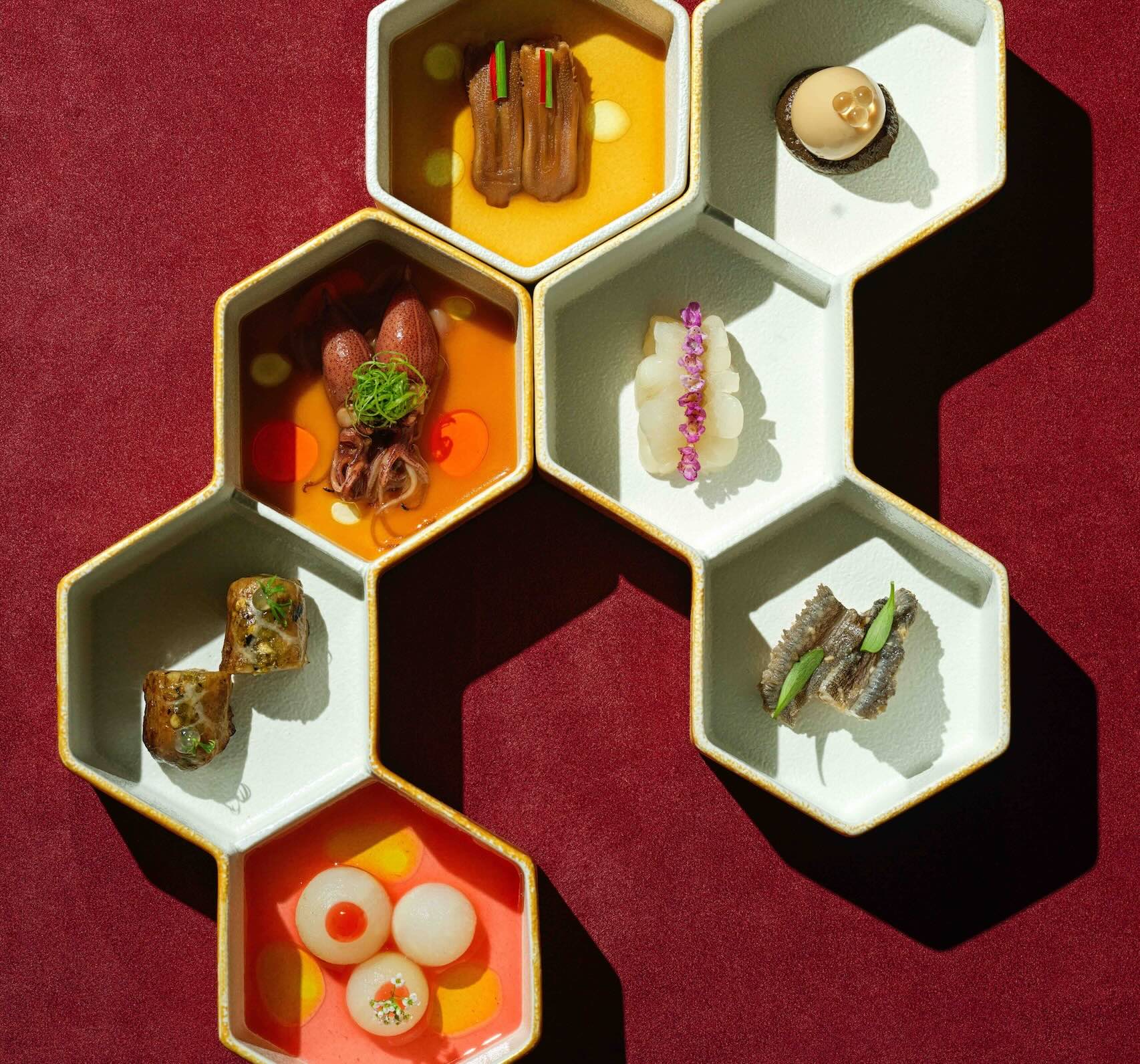 「七巧板」前菜以華人宴席涼菜文化為靈感,透過酸、甜、鮮、辣、麻、苦、香七種味型鋪陳整套菜單的味覺序曲。(圖片提供:Circum-)