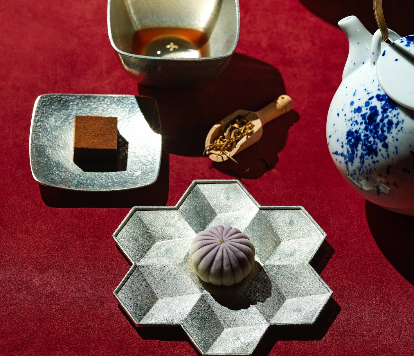 尾聲的「結好果」,以如抽籤般隨機登場的茶點收尾。鐵觀音生巧克力、冰洛神梅練切、草莓優格大福等,以和菓子技法結合華人飲茶文化,讓每一位離席的賓客,都帶著一份獨屬自己的味覺記憶離開。