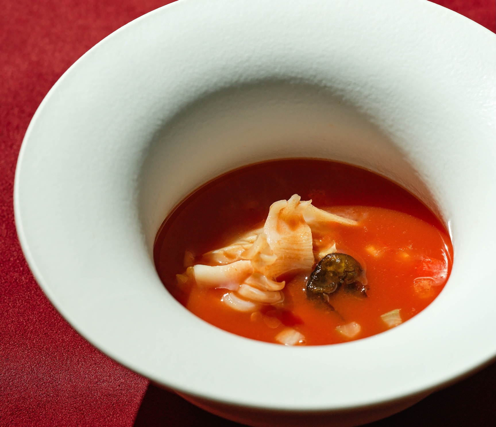 取材自貴州苗族酸湯魚文化,四種番茄發酵十天後與昆布雞湯融合,搭配旬鮮貝類呈現酸香與海味交融的風味。(圖片提供:Circum-)