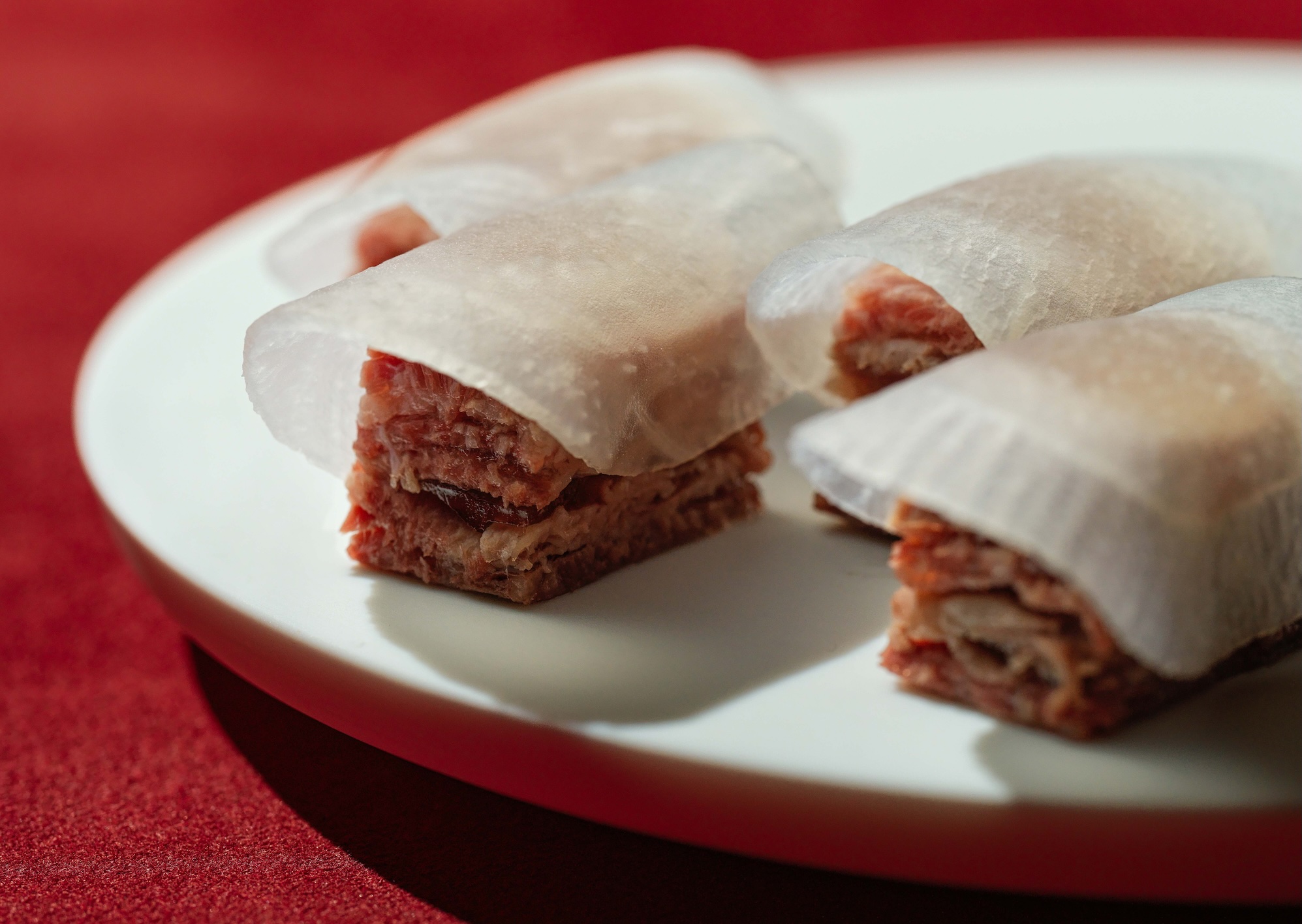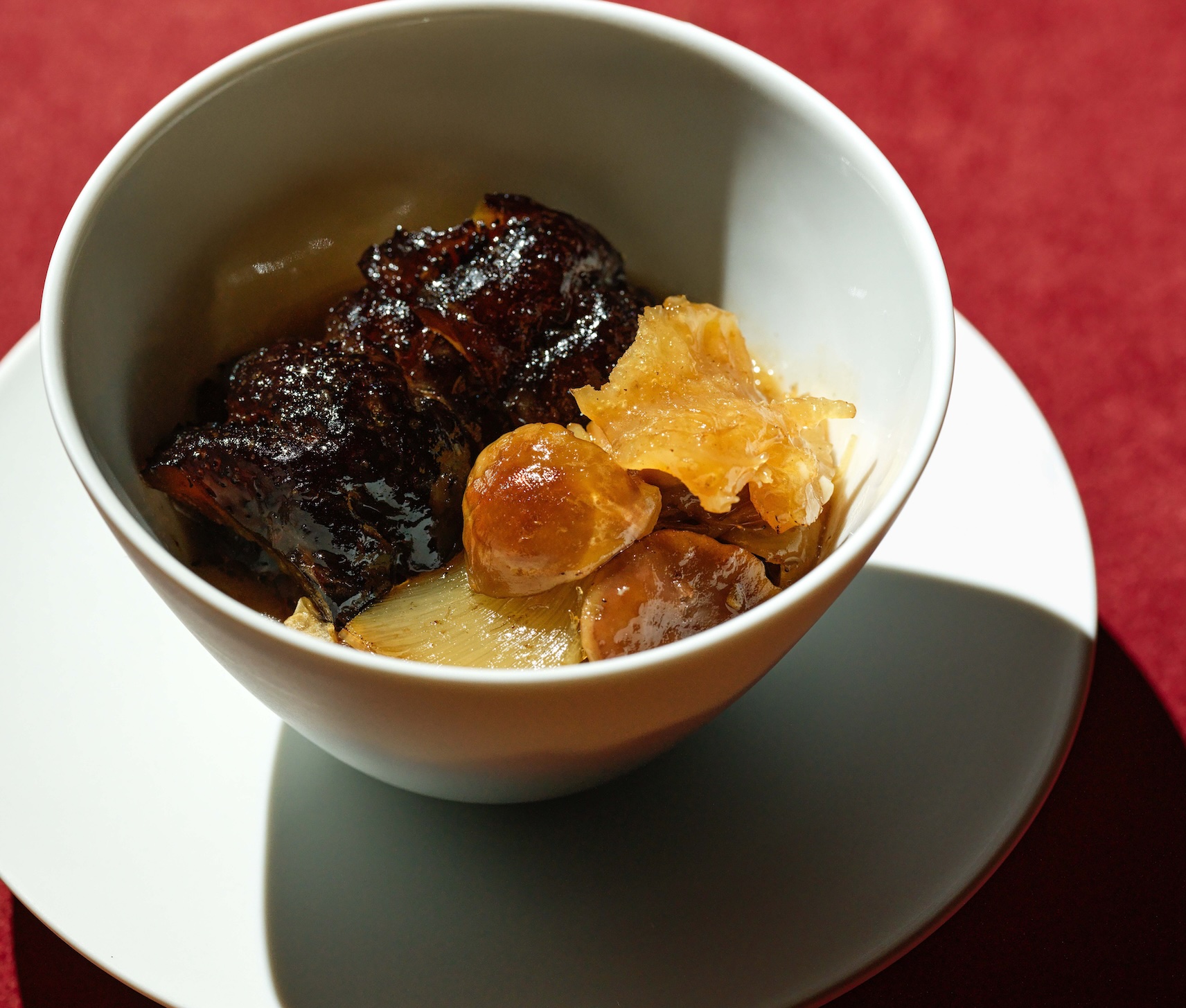 但在最關鍵的牛肉處理上,他走了一段彎路。傳統大塊滷牛肉試過,滷完切碎重新塑形也試過,始終覺得沒有達到Circum-的水準。最終,他換了一個完全不同的思路:以製作火腿的方式處理牛肉,切成薄片後層層堆疊,片與片之間刷上牛高湯凍。「咬下去你會感覺到果凍在嘴巴裡化開,可是你又吃得到肉的口感,」他描述道。這個處理方式,讓每一口都同時帶有肉的紮實與湯汁的鮮潤。