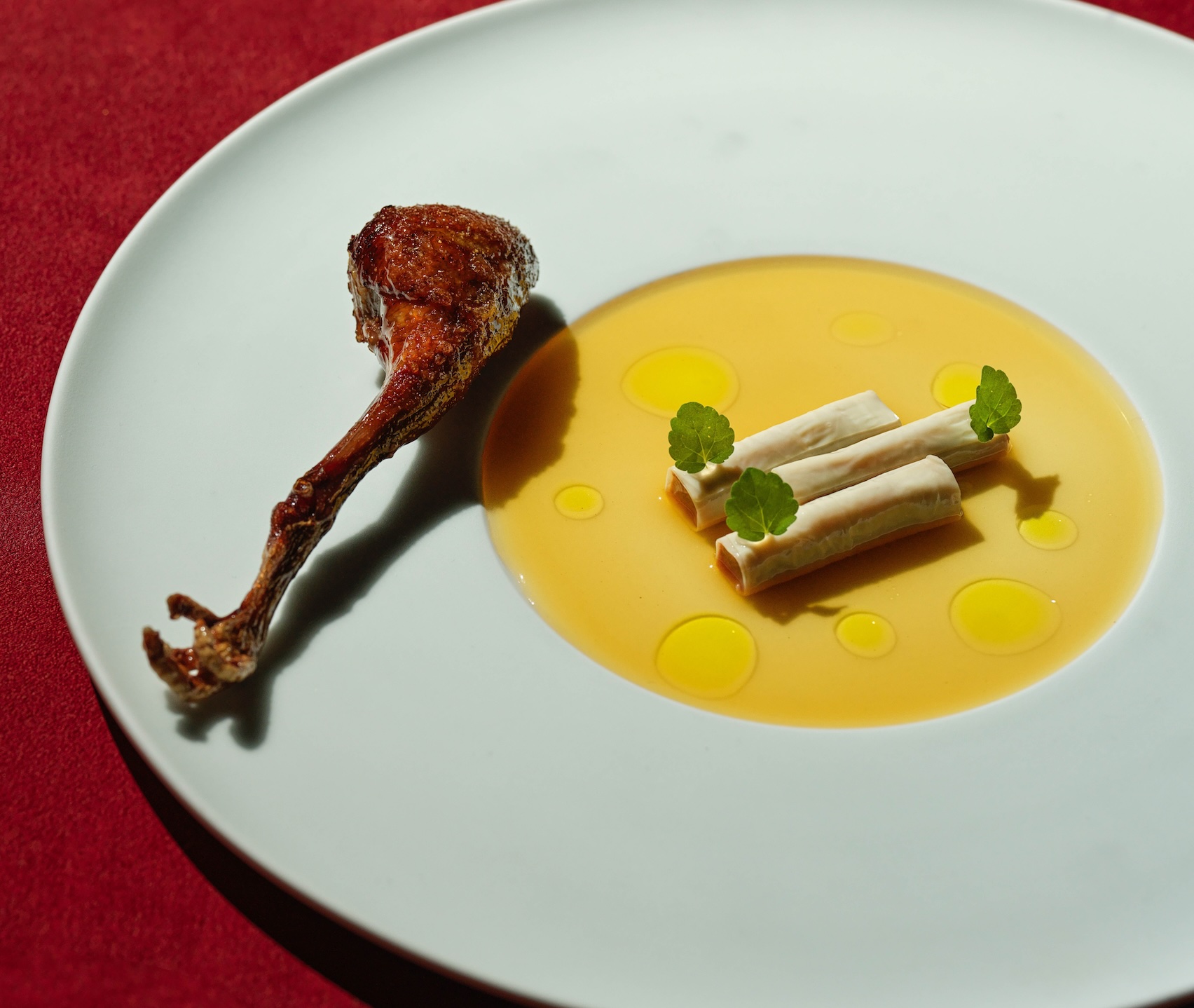 第一吃是冷盤鴿胸,將去皮鴿胸浸泡於白芷、川芎、當歸與天津玫瑰露酒中低溫鎖住肉汁,外層以雞湯燙煮的湯葉包覆,交織出深遠風韻。第二吃則是香炸乳鴿腿,這裡藏著一個不易被察覺的工序:Leo將拆解乳鴿時取下的鴿皮,盡量塞回腿肉之中,確保油炸時溫度足夠高,讓皮脂的油脂充分釋放。「咬下去的汁水會更多,」他說,「外面是焦脆的,但是有多汁。」焦脆與多汁,原本是對立的口感,在這一口之間同時成立,也是Leo用當代廚藝語言,給出的一個新的解法。