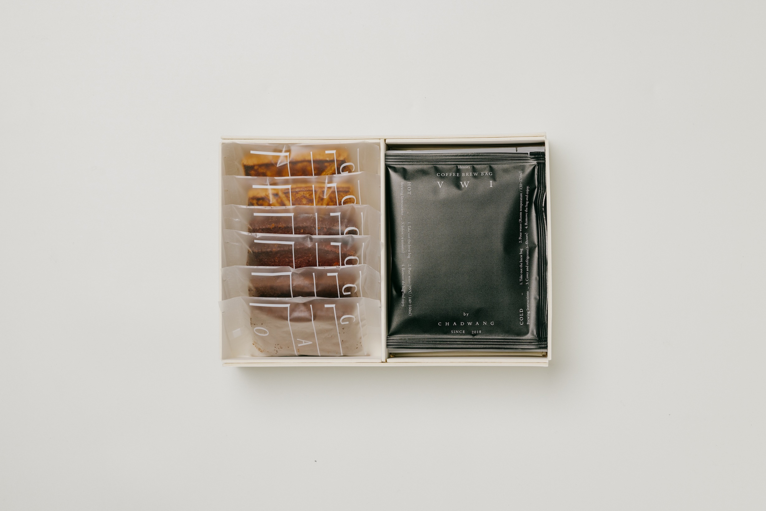 「我覺得品味很像,所以就決定可以合作。」王策說得簡單,但背後是他多年在國際場域合作的直覺,這種相似度,是少有的。這次聯名命名為「三態之間」,概念源自咖啡手沖的三個關鍵階段:悶蒸(Blooming)、主沖段(Main Pour)與尾段萃取(Drawdown)。設計團隊將VWI by CHADWANG的品牌意象融入GAO的Logotype結構之中,形成視覺上的流動感,對應的,是甜點製作裡風味依序展開的節奏。