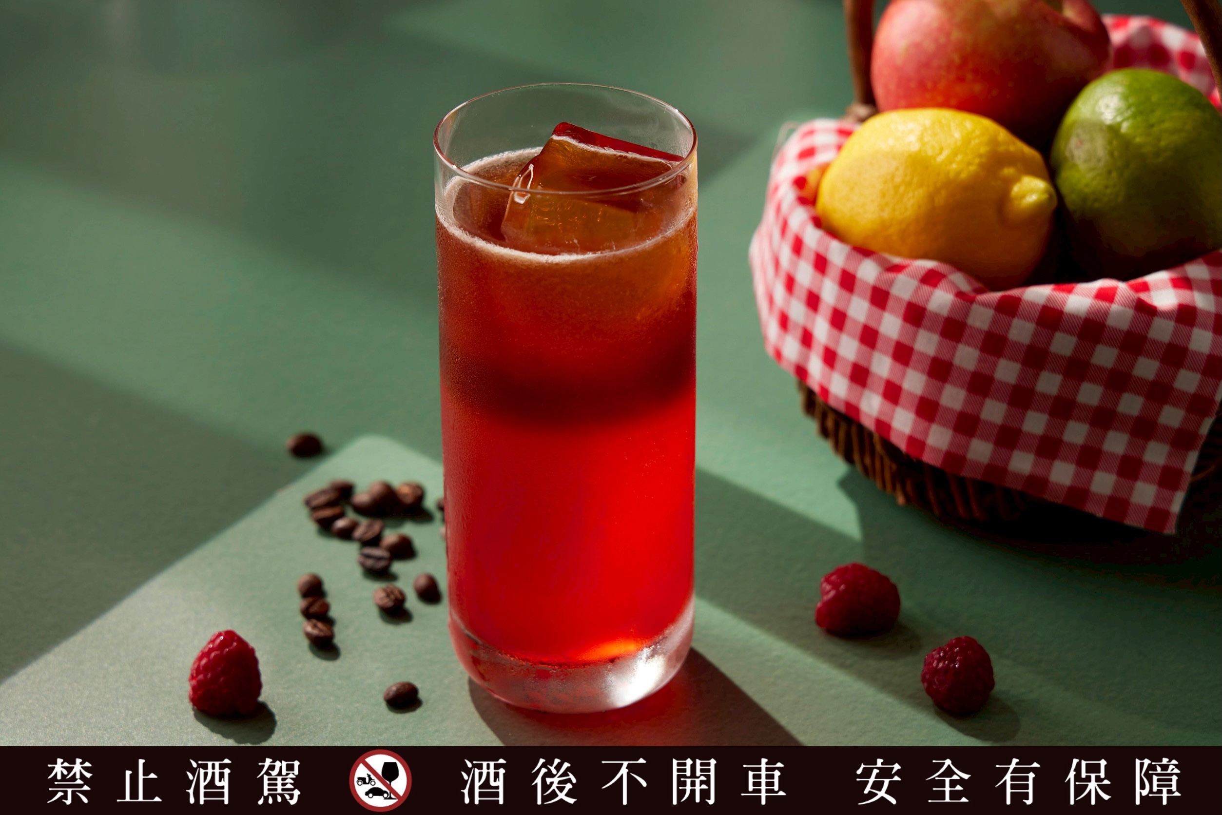 咖啡調酒「小紅帽」以覆盆莓、皮斯可酒、接骨木花與胡椒交織冷萃咖啡,酸甜與草本層次並行,風味結構帶有明確的敘事節奏。(圖片來源:台北艾麗酒店)
