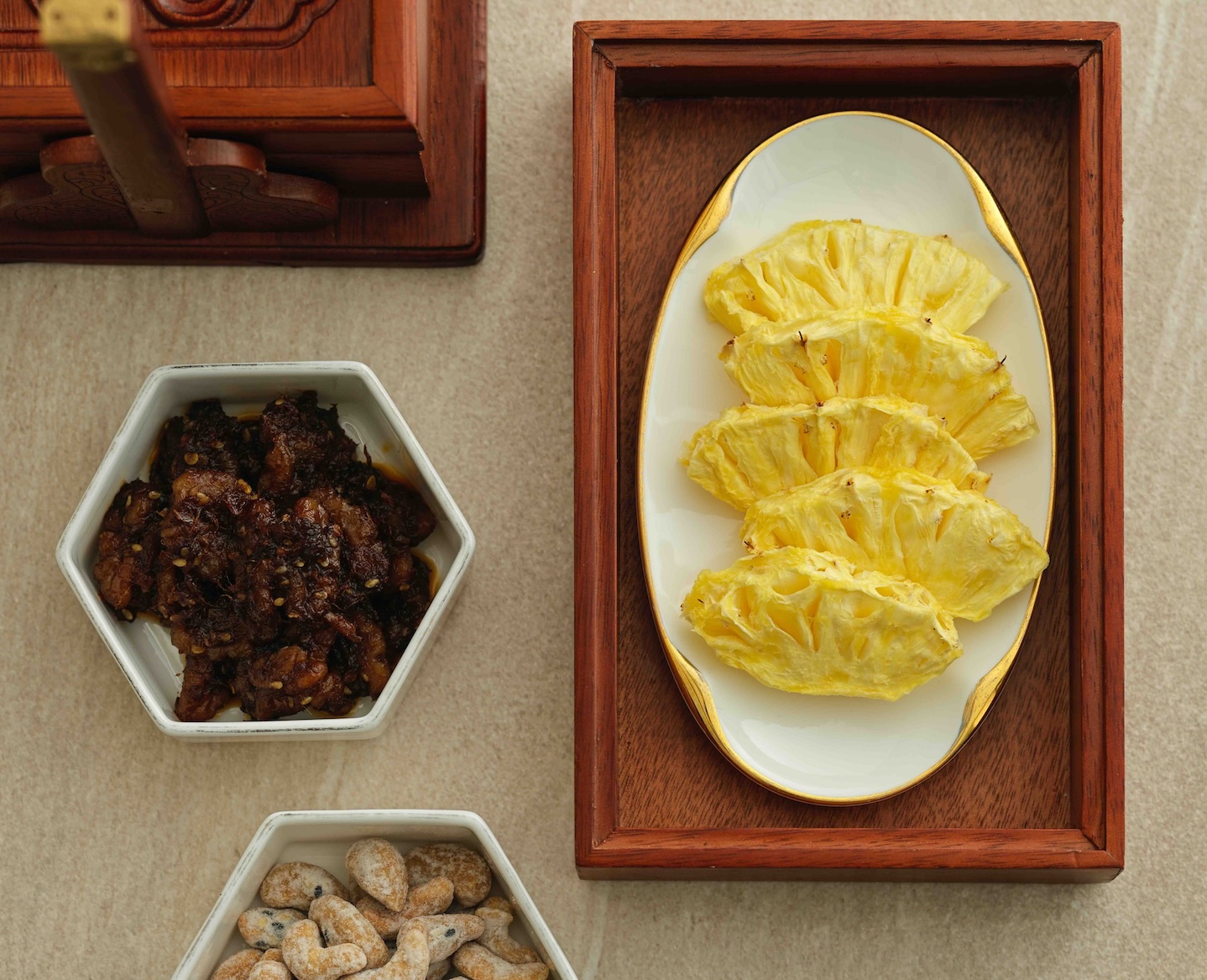 朝擺用時令瓜果・泡椒核桃・掛霜腰果,以川味的酸、辣、甜、鹹為席間風味的第一道引線。(圖片來源:嘉林餐旅集團)