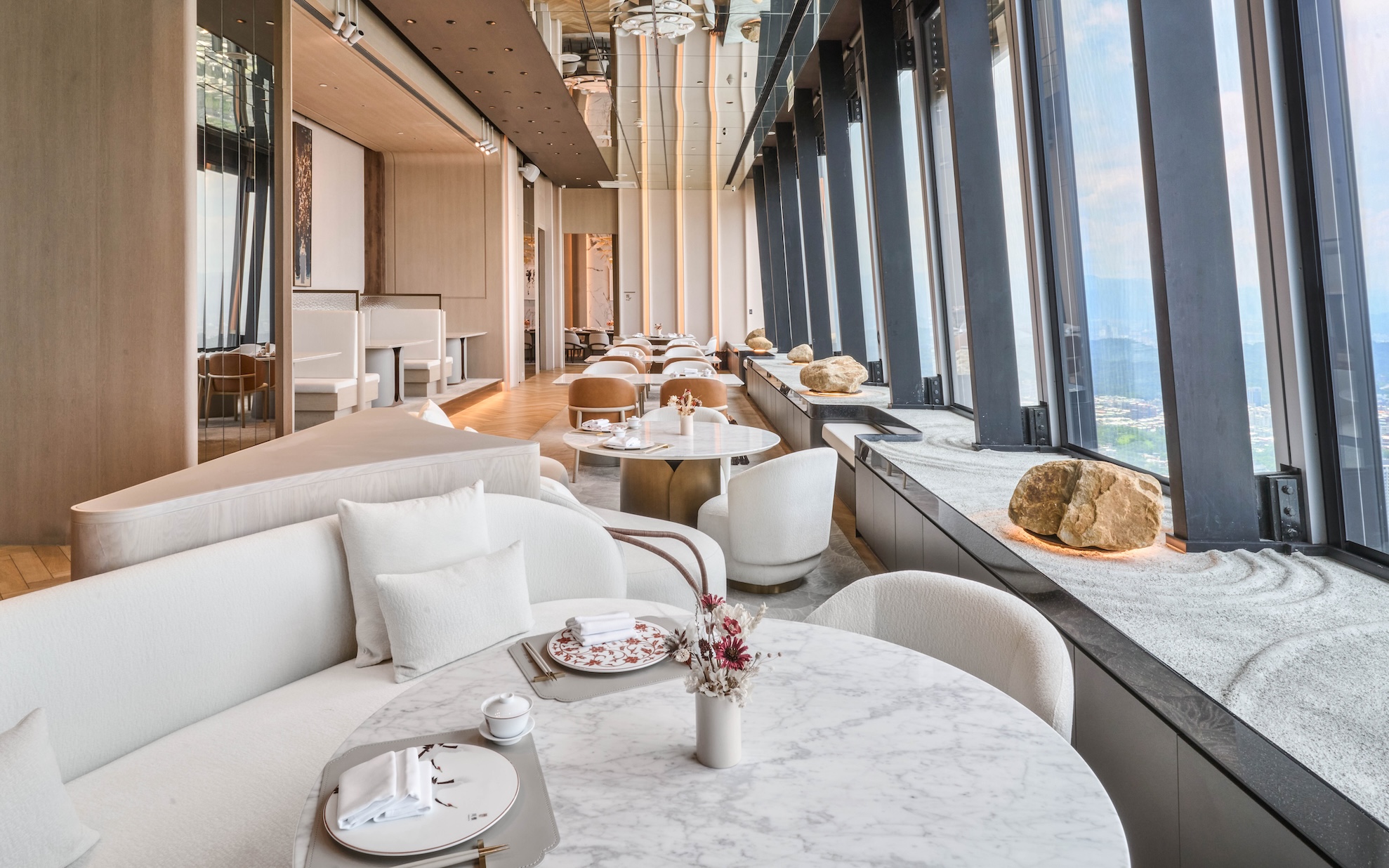川雅位於微風南山46樓,以低飽和色調與「辣椒」意象構築空間語彙,在城市天際線中營造內斂而細膩的川味場域。(圖片來源:嘉林餐旅集團)