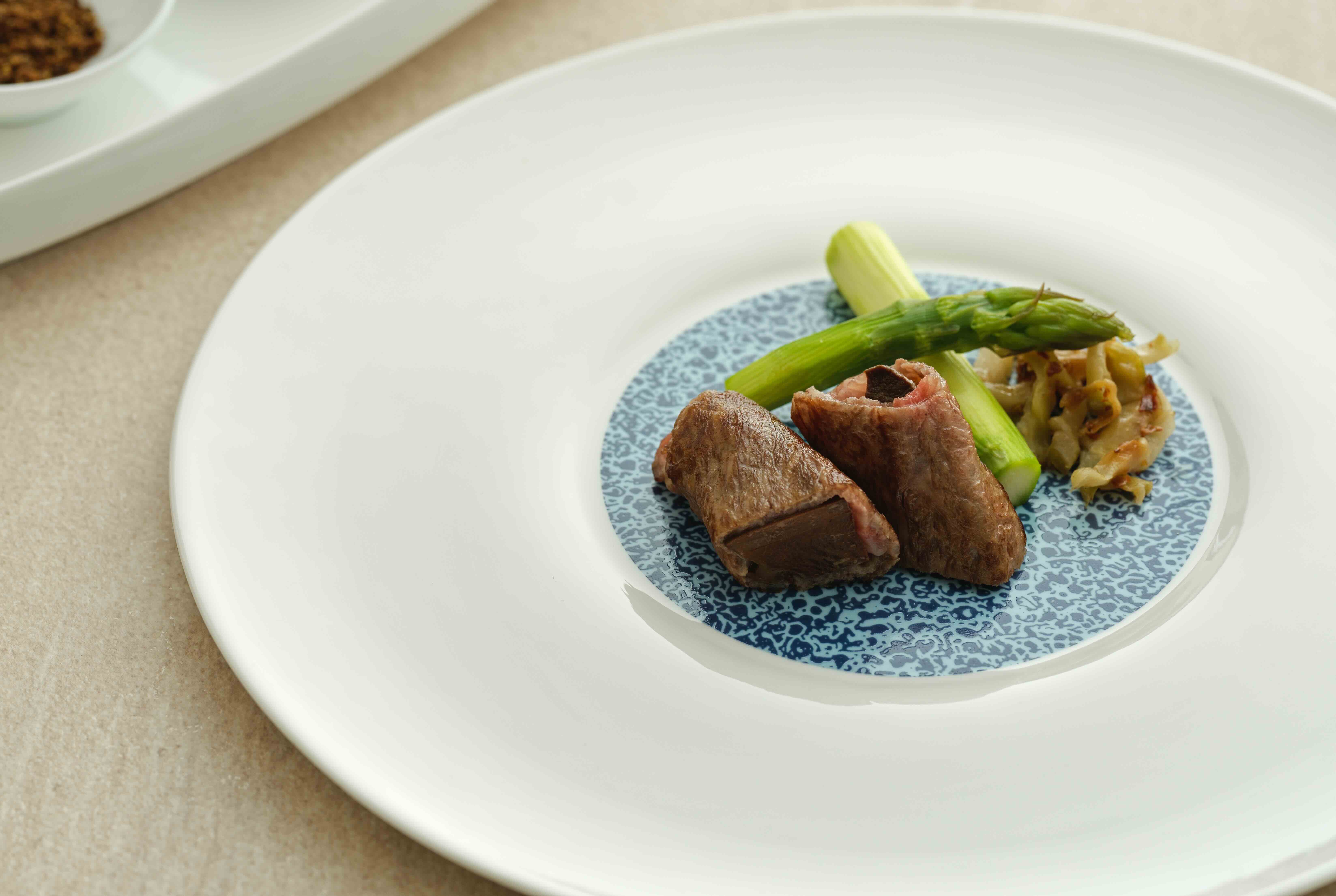 以A5和牛包覆南非鮑魚,搭配豆瓣、青花椒與牛肉椒鹽三款醬料,演繹山海交融的多重風味層次。(圖片來源:嘉林餐旅集團)