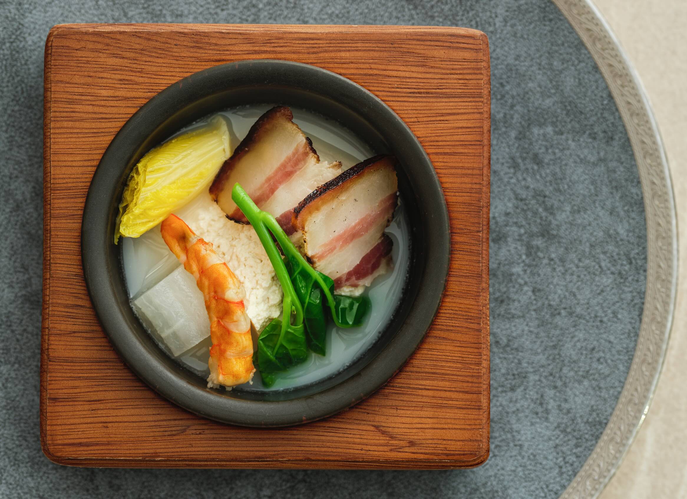 以八小時熬製的乳白奶湯為基底,結合煙燻豆腐、臘肉與蝦乾,濃郁中帶溫潤,呈現官府工藝與農家風味的交會。(圖片來源:嘉林餐旅集團)
