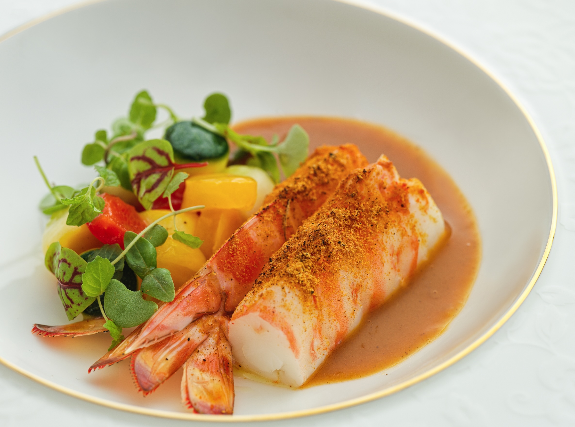 川話裡,「糊」是焦香,不是失手燒糊的意思。這個細節他強調了好幾次。糊辣味型是川南的江湖標記,重慶火鍋的那種濃烈、串串香的那種隨性,在這道菜裡被整理成一個有結構的敘述,如串串燒烤粉炙燒的明蝦、蝦湯與二荊條熬製的火鍋風味底醬,然後是點在最上層的糊辣紅油,「那一抹焦香,讓蝦的鮮甜在辛辣層次中更立體。」