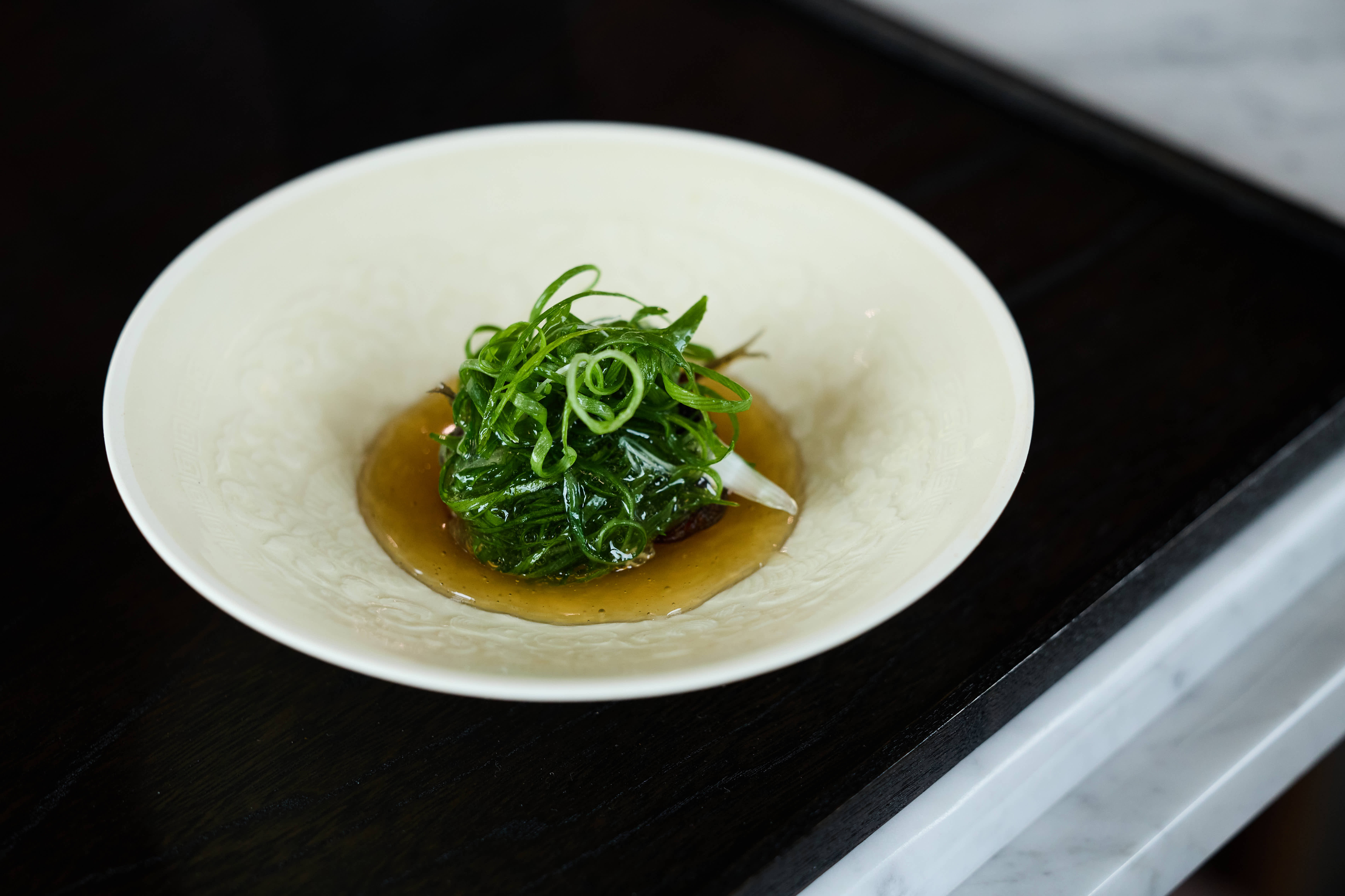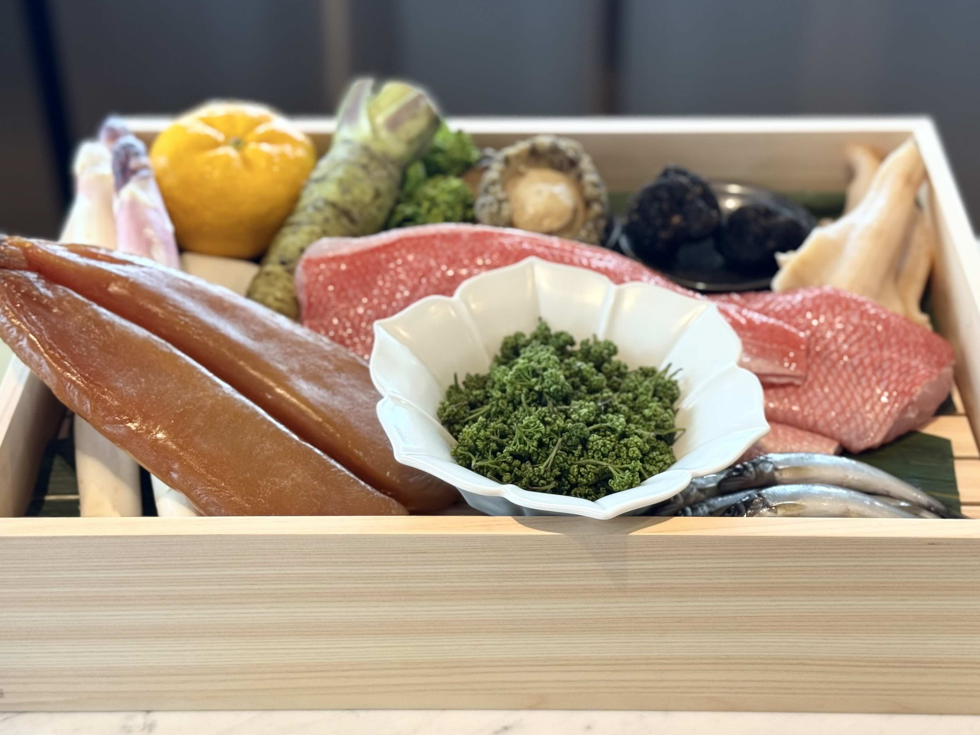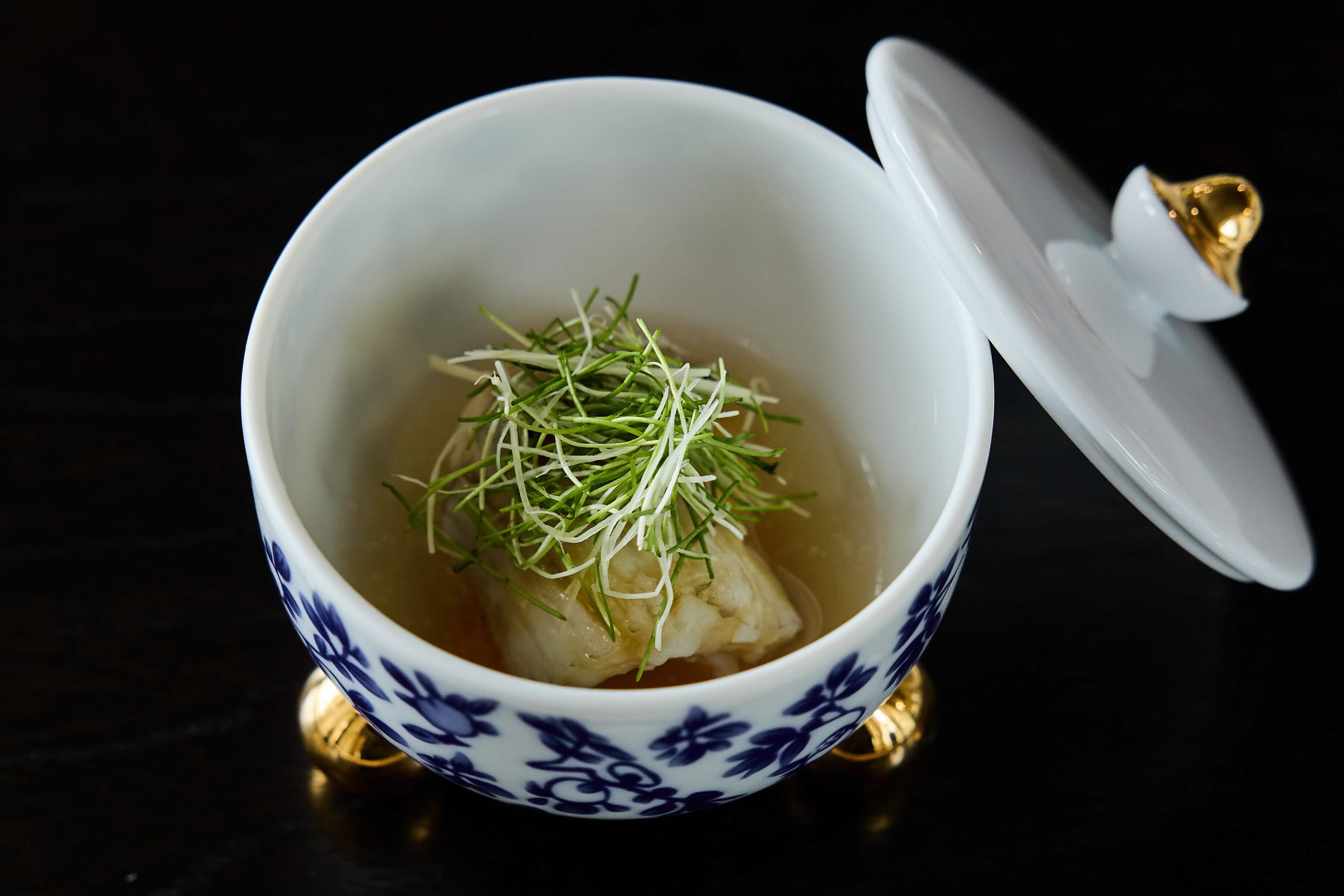 開場的「柚子釜」,為因應台灣天氣已較日本溫暖,特別藉柚子的明亮酸度打開味蕾。主廚剖開柚子取出果肉,以柚子汁與橄欖油醃漬伊勢龍蝦與蒸鮑魚,盛入柚子釜,點綴昆布凍與魚子醬,再覆上象徵吉祥的松葉枝。「白甘鯛.發酵白菜」則是上田吃了台灣酸菜白肉鍋之後的再創作,將白甘鯛替換豬肉,以酒蒸鎖住魚肉水分,讓發酵白菜的自然酸香滲入,點綴薑絲與芽蔥,風味清雅。