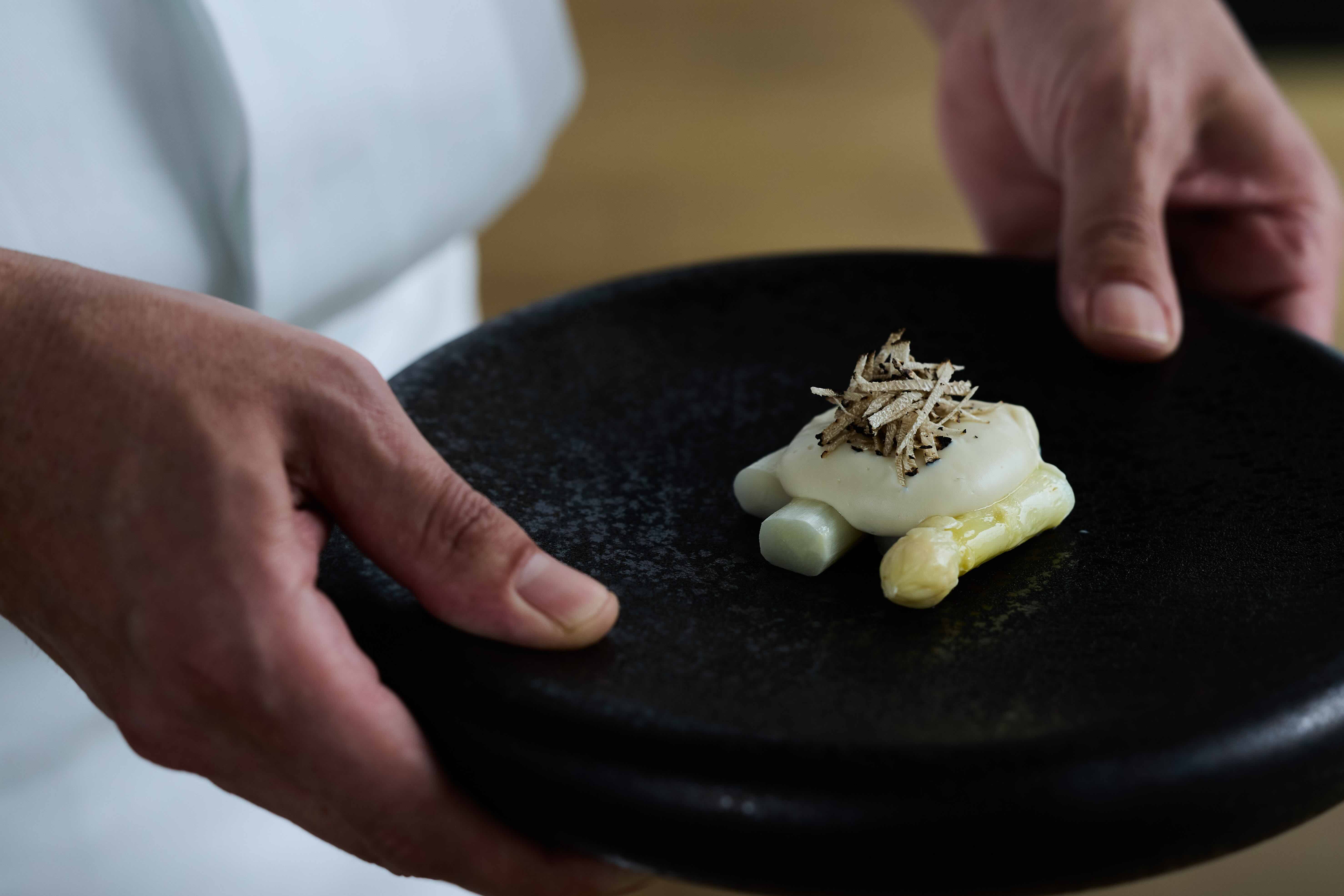 那塊豆腐就此成為料理「白蘆筍白和・黑松露」的靈魂。為了確保新鮮,料理團隊在餐會前一日,3月25日中午專程到豆腐坊門口排隊,取回最新鮮的當日豆腐。這道細節,幾乎說明了安久做事的方式。