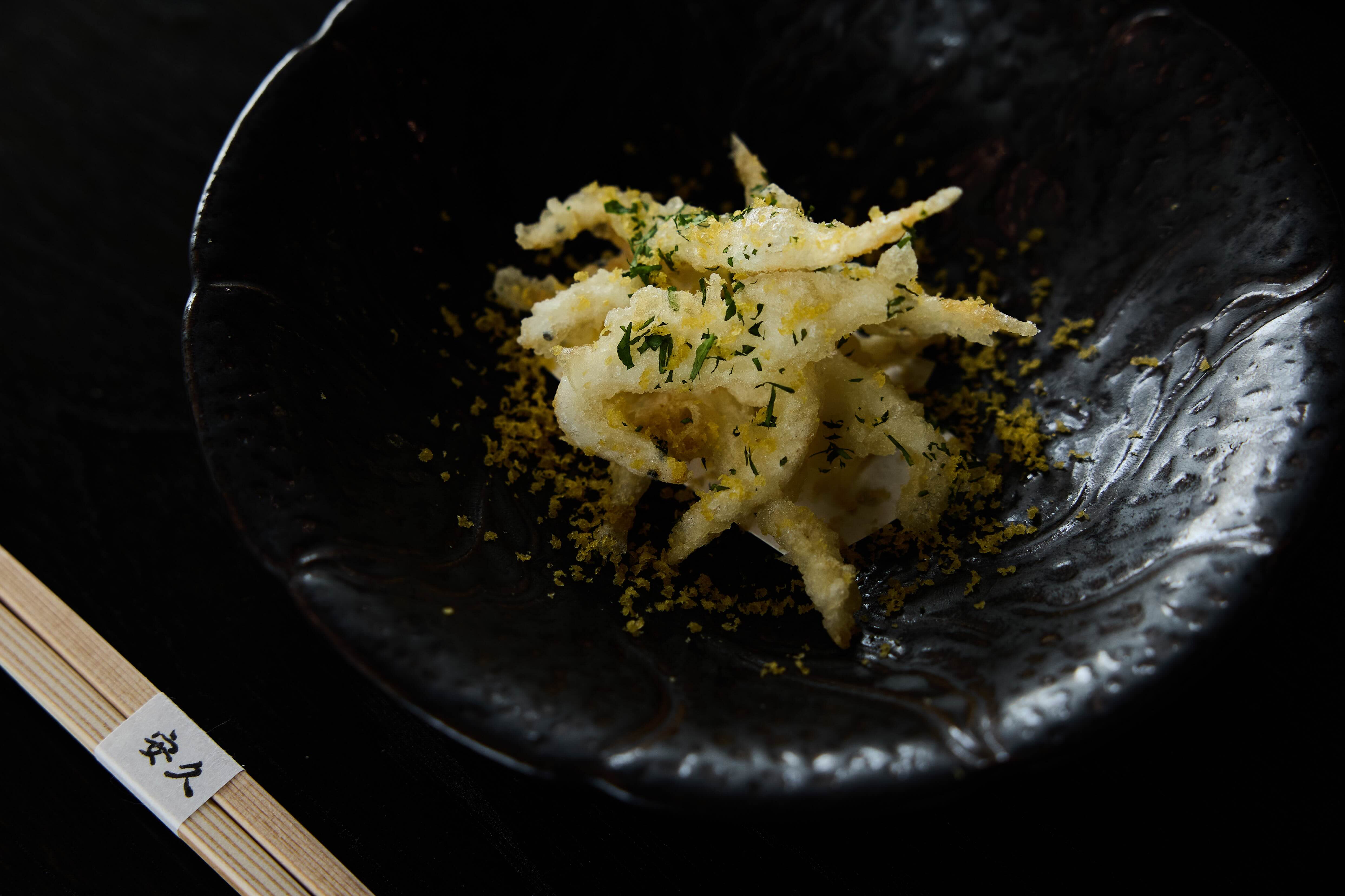 「香魚・九条葱」則藏著另一層季節趣味。上田解釋,這次準備的香魚尺寸比較小,正是這個時節的特色。初春的香魚體型纖細,以低溫細火炸至骨肉酥脆,外層輕薄不顯厚重,搭配甘醋醬汁與九条葱,酸香與焦脆在口中交錯展開。他也藉這道料理點出台日之間的季節時差,香魚登場的時間兩地稍有錯落,卻讓這種差異轉化成有趣的味覺層次。