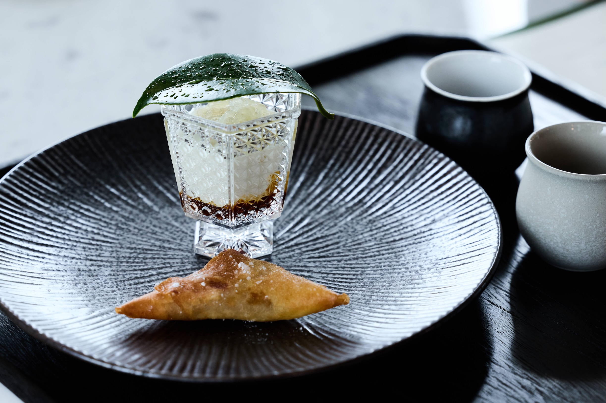 「白魚天婦羅・現磨烏魚子・木之芽」是一道藏著時間感的料理。纖細的白魚輕裹薄衣入鍋,炸至外層酥鬆、內裡仍保細嫩水分後出鍋,搭配的烏魚子是上田主廚在去年底親手製作、靜候熟成,到近日才進入風味最佳的狀態。他以現磨烏魚子取代鹽來提味,磨出的鹹鮮滲入白魚的柔軟之中,再點綴春日山椒嫩葉(木之芽)的清辛,三種層次在口中緩緩散開。元茶師Ivy建議,品嘗時先喝一口茶,讓茶的果香在口腔中充分散發,再搭配一口料理,茶湯的介入,會讓整道菜的風味延長,層次更加豐富。這也是主廚與寶元紀元茶師反覆試配後得出的結論。