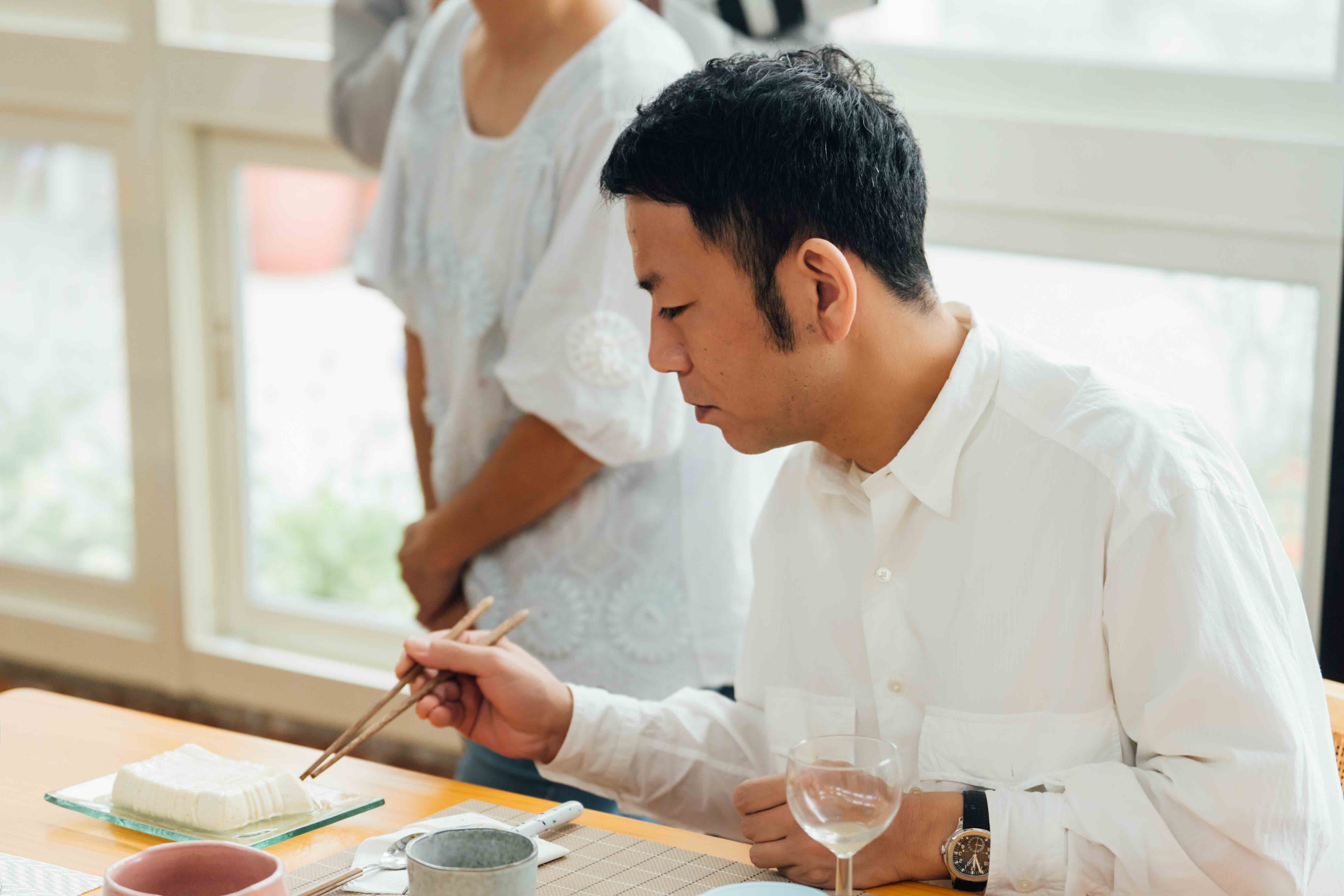 餐會前夕,上田陽三親自走訪台灣各地產地。他去了苗栗的「穿龍老屋豆腐坊」、彰化的「番挖水耕農場」,還有全台最大黑蜆外銷場「通利水產」。在魚塭邊,他走下去,親眼看養殖業者如何順應地形設計生態循環;在豆腐坊,他嚐了一口以花蓮一號有機黃豆、百年穿龍圳水製作的手工鹽鹵豆腐,沉默片刻後說:「京都以甘甜水源聞名,豆腐是當地代表性料理,這豆腐的純粹豆香,和京都豆腐極為相似,卻又帶著獨特的風味。」